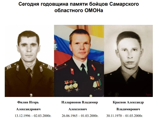 Прошло 26 лет с трагической гибели сотрудников ОМОН ГУВД Самарской области: Илларионова Владимира Алексеевича - подполковника милиции, Филина Игоря Алексеевича - прапорщика милиции, Краснова Александра Владимировича - прапорщика милиции. Это были первые потери нашего ОМОНа в той, теперь уже далекой и одновременно близкой, чеченской войне. Боль утраты не утихает, продолжая жить в наших сердцах.