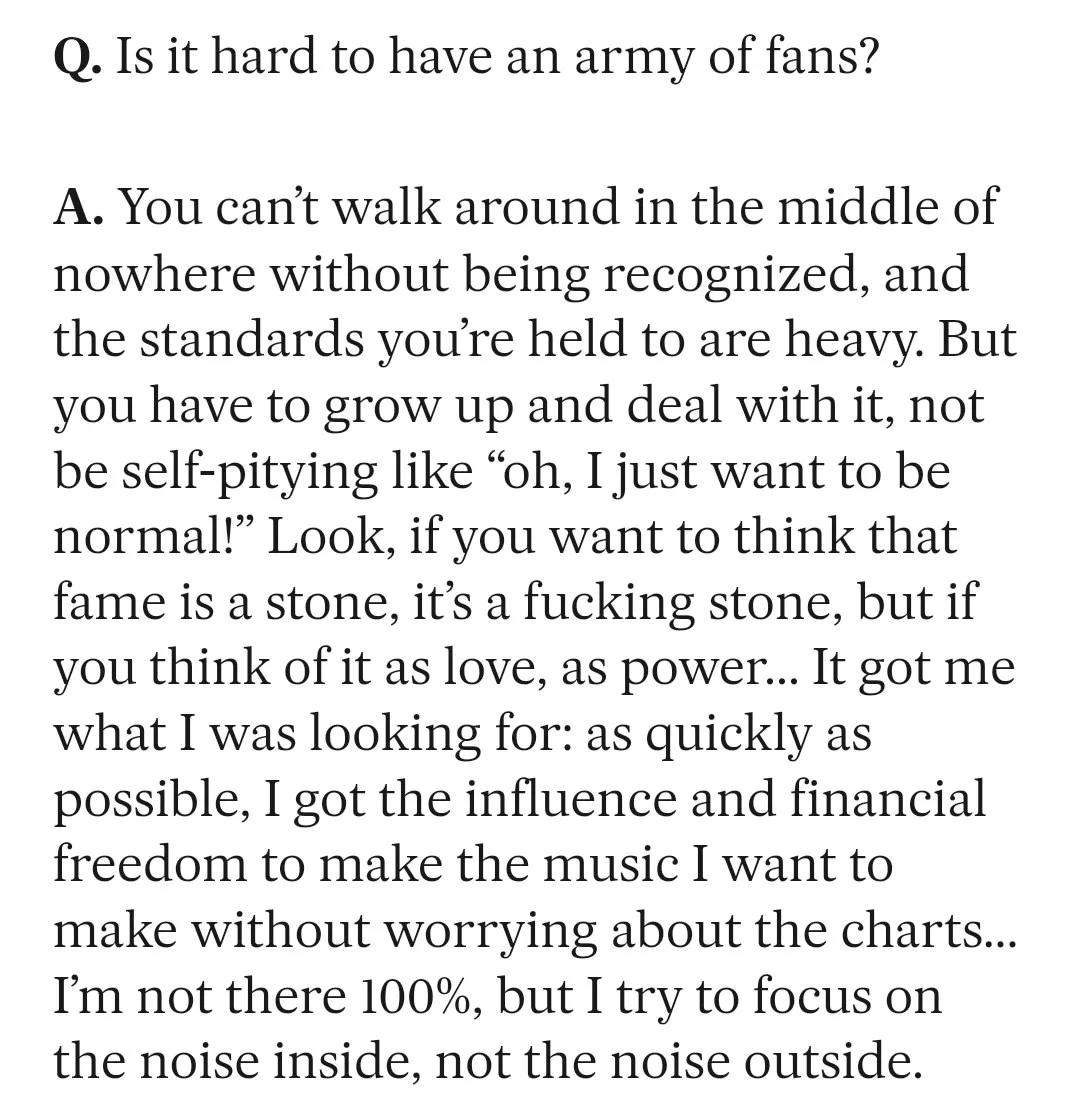 Намджун: Ты не можешь просто ходить где-то посреди ничего, чтобы тебя не узнали, и стандарты, которым ты должен соответствовать, очень высоки. Ты должен повзрослеть и справляться с этим, а не жаловаться в духе: "Ох, я просто хочу быть нормальным!". Слушай, если ты хочешь думать, что слава — это камень, то это чертов камень, но если ты воспринимаешь её как любовь, как силу... Она дала мне то, что я искал: я как можно быстрее получил влияние и финансовую свободу, чтобы создавать ту музыку, которую хочу, не переживая за чарты. Я ещё не на 100% там, но стараюсь сосредотачиваться на шуме внутри, а не на шуме снаружи