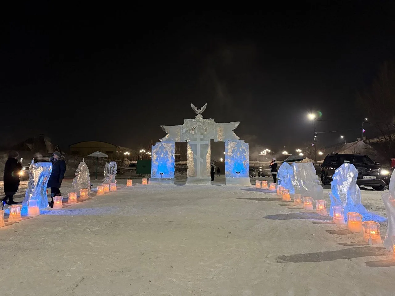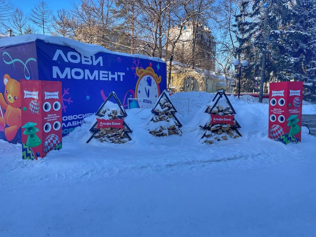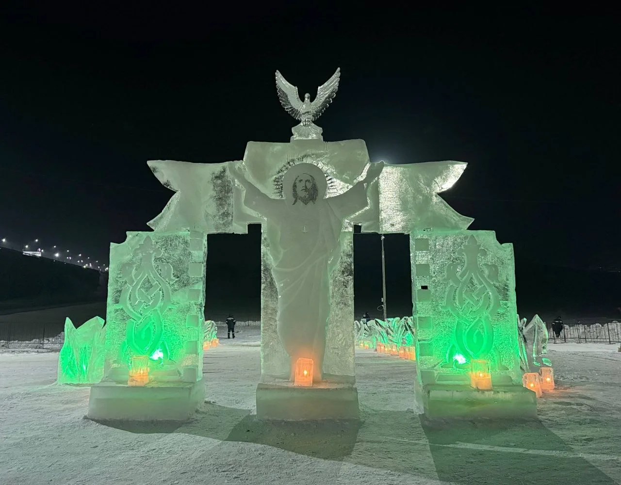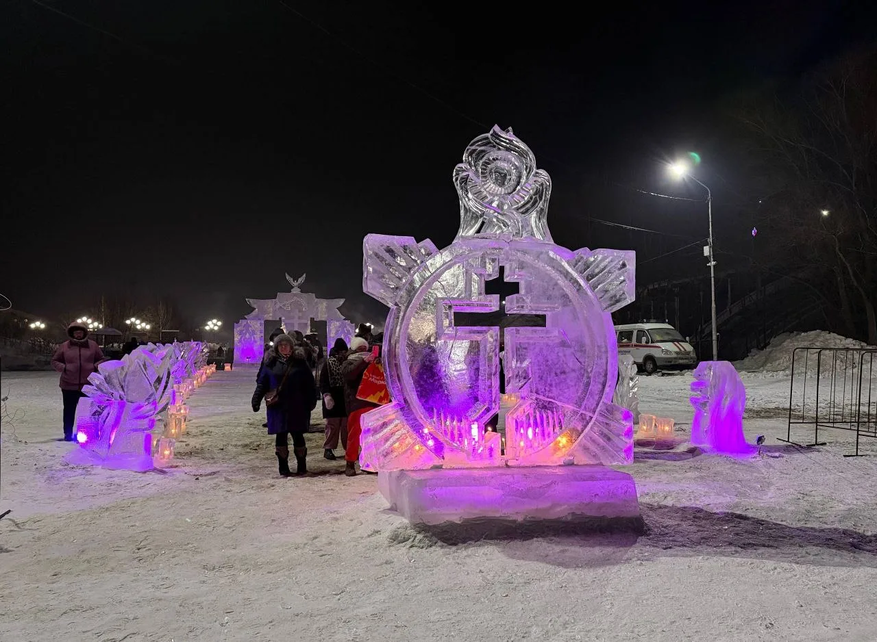 Фото праздничного городка из Бийска - там, как и всегда, изящные ледяные композиции и тёплая атмосфера даже в сильный мороз.