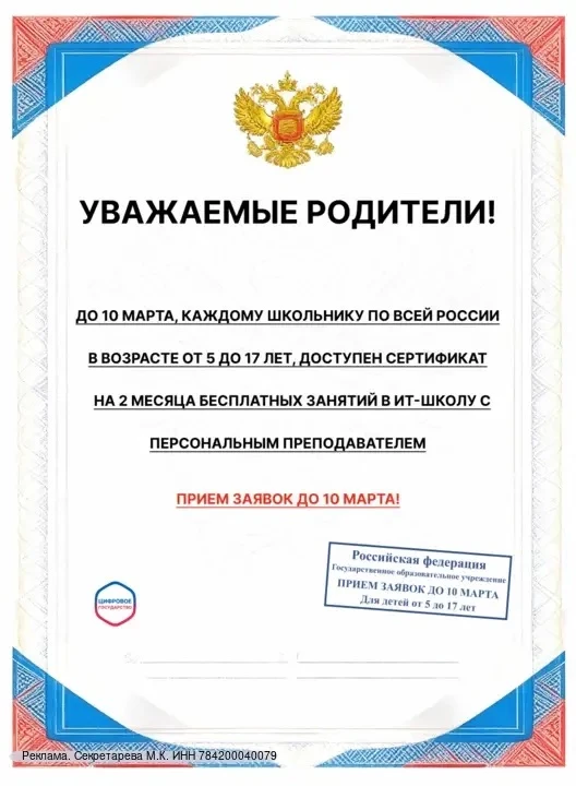 ❗️ Уважаемые родители, внимание! До 10 марта каждый ребенок по всей России в возрасте от 5 до 17 лет может получить сертификат на 2 месяца бесплатных занятий в школе программирования с персональным преподавателем.