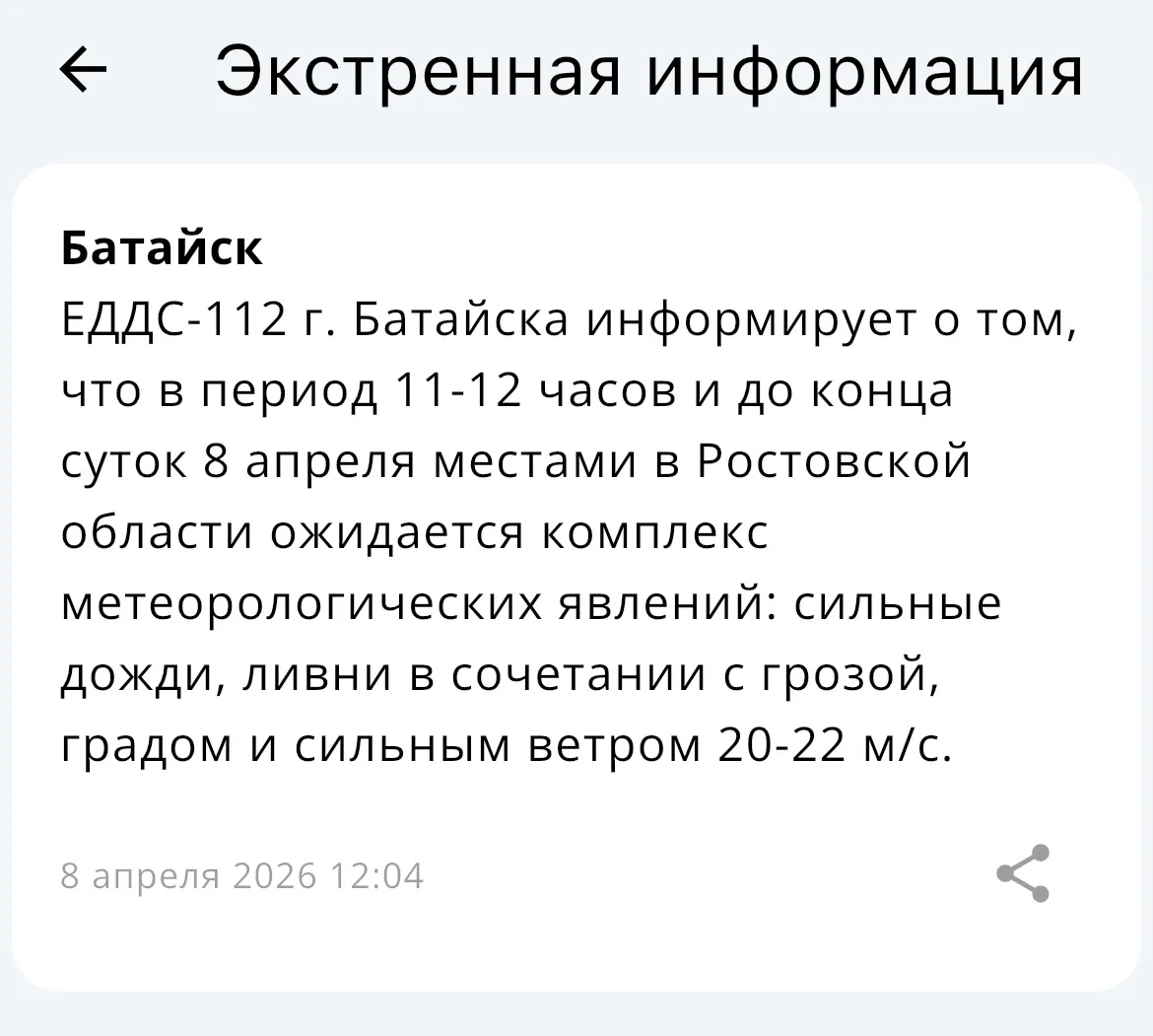 ЕДДС-112 г. Батайска информирует о том, что в период с 11 до 12 часов и до конца суток 8 апреля местами в Ростовской области ожидается комплекс метеорологических явлений: сильные дожди, ливни в сочетании с грозой, градом и сильным ветром 20–22 м/с.