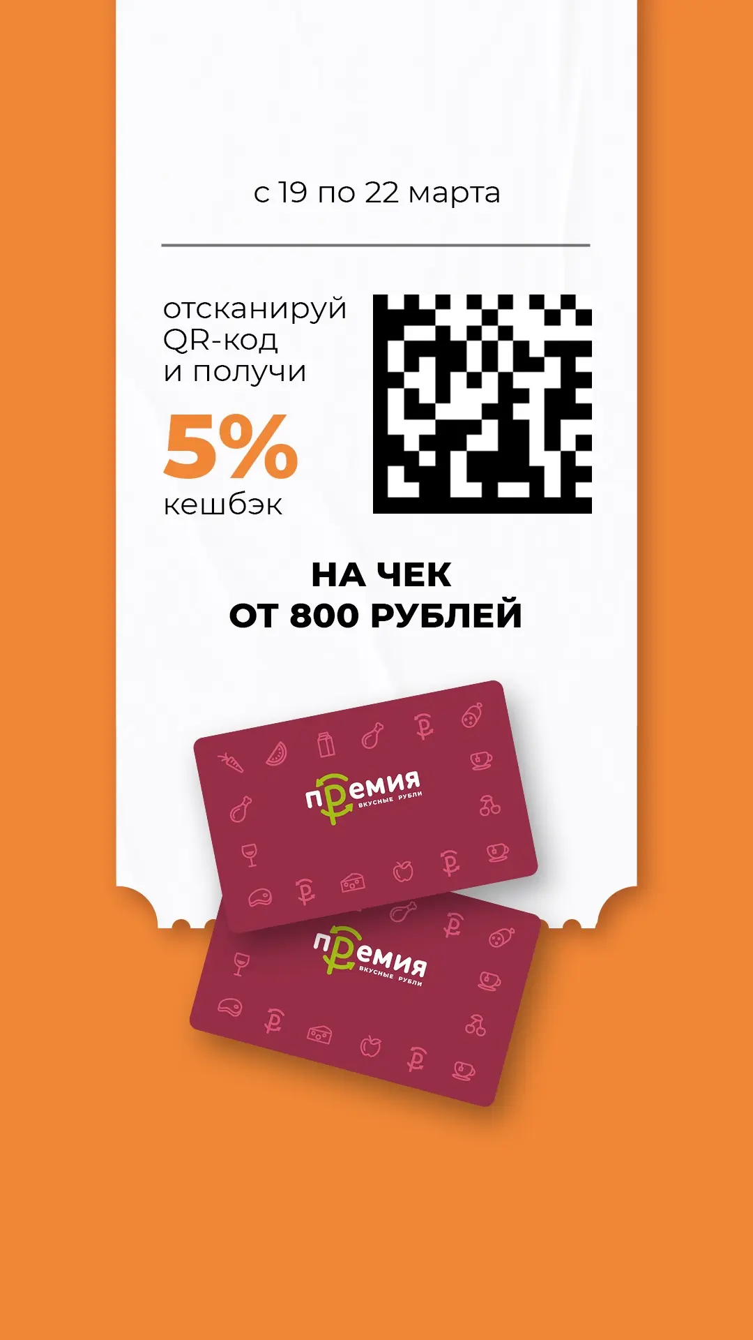🪙 5% кешбэк на чек от 800 рублей с 19 по 22 марта.