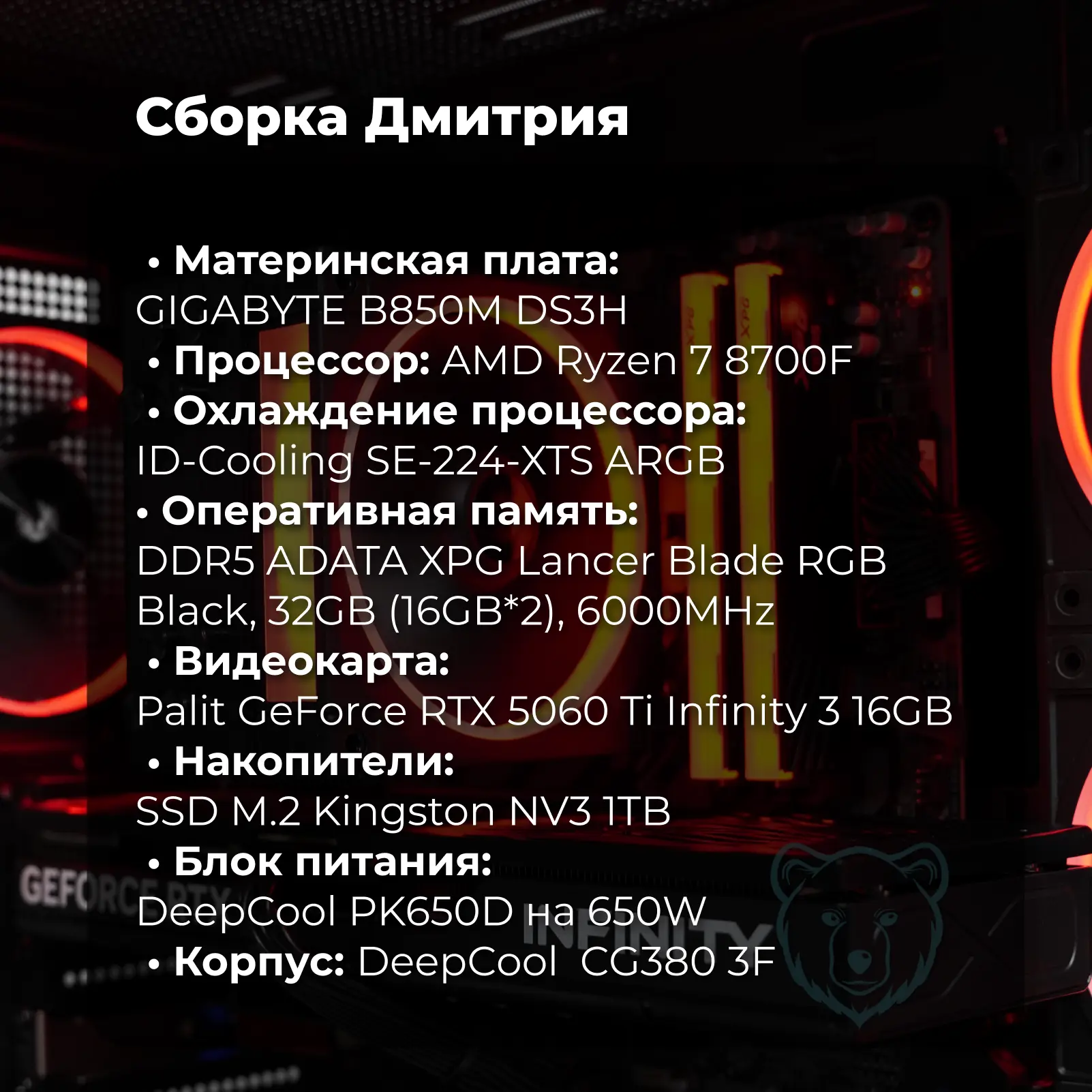 Дмитрий решил не дожидаясь Нового года подарить себе новенький, мощный ПК. Мы посчитали клиенту топовую связку для Full HD на «ультрах» из процессора AMD Ryzen 7 8700F и видеокарты Palit GeForce RTX 5060 Ti Infinity 3 16GB. Получилась надёжная конфигурация для онлайн и офлайн-игр!