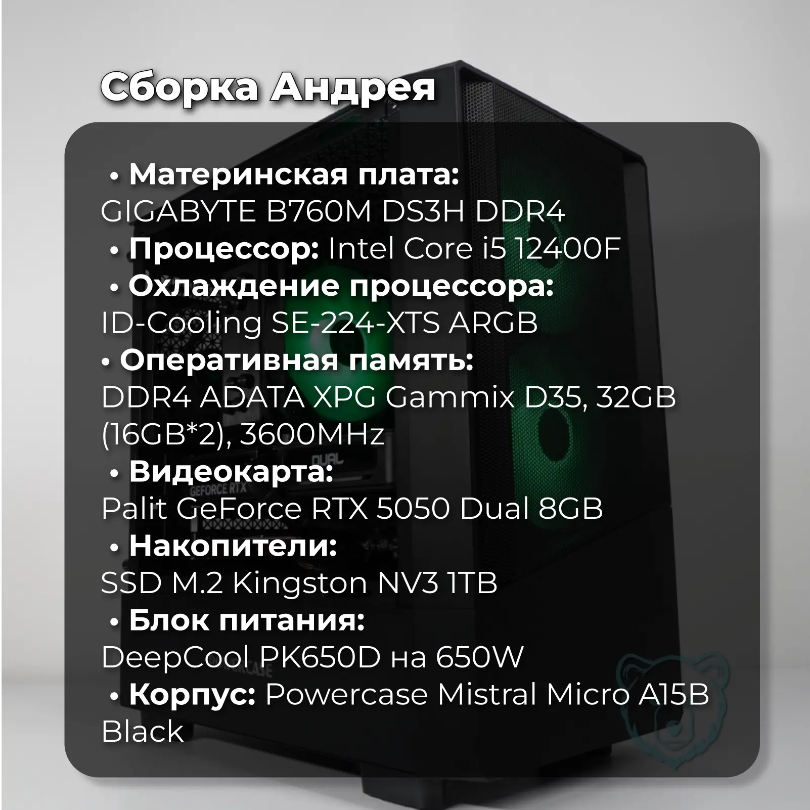 Роман тоже решил апнуть свой сетап для 2K-гейминга. Клиенту понравилась связка из процессора AMD Ryzen 7 7800X3D и видеокарты Nvidia GeForce RTX 5070 12GB в «аквариуме» 1StPlayer Megaview MV6-Т, обязательно с эстетичными вентиляторами. Мы предложили несколько вариантов, клиент выбрал вертушки от XASTRA.