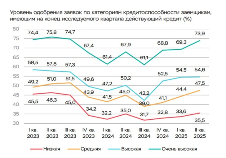 🔵При этом одобряемость заявок растёт, по всем категориям кредитоспособности показатели находятся почти у максимумов 2023 года.