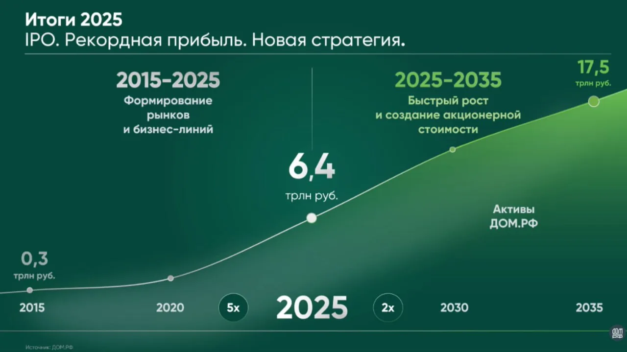 🔵Чистая прибыль ДОМ.РФ в 2025 году выросла на 73% — до 73,3 млрд рублей. Активы увеличились на 20%, рентабельность собственных средств достигла 20%.