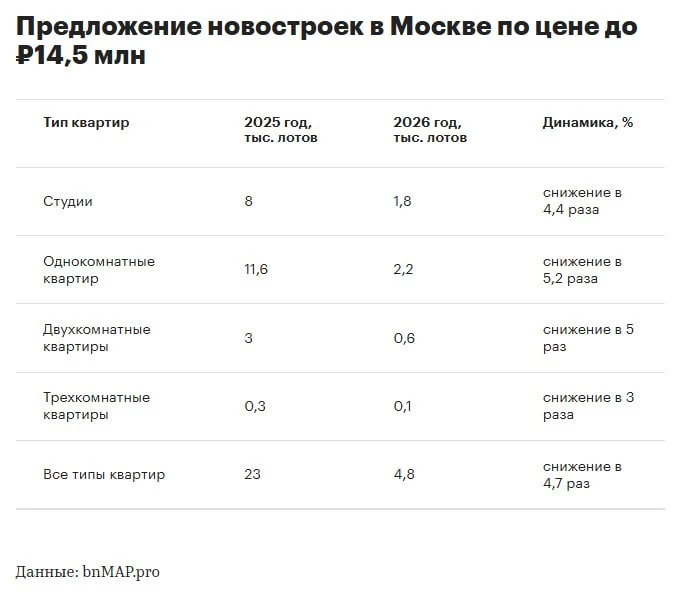 🔵 В феврале в Москве насчитывается около 4,8 тыс. лотов до 14,5 млн ₽. Год назад — 23 тыс.