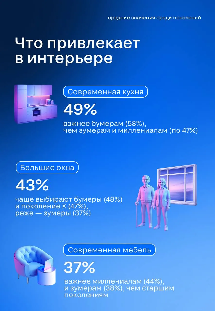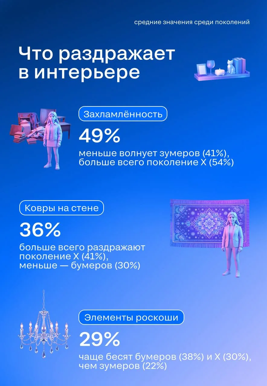 🔵10% зумеров находят предметы роскоши в интерьере привлекательными, а для поколения Х и бумеров золото, вензеля или бархат становятся стоп-факторами при выборе жилья.