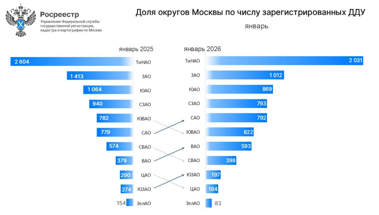 Росреестр подвёл итоги января 2026 года по числу зарегистрированных ДДУ в разрезе административных округов столицы.