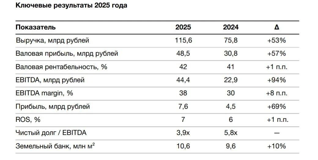 Согласно отчетности по МСФО, по итогам 2025 года выручка девелопера достигла ₽115,6 млрд , валовая прибыль составила ₽48,5 млрд, а чистая прибыль — ₽7,6 млрд.