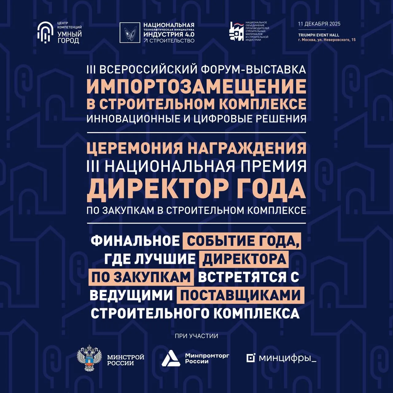 III Национальная Премия «Директор года по закупкам в строительном комплексе» — ежегодное отраслевое событие, признающее достижения в развитии лучших практик сферы закупок, пройдет 11 декабря в Москве в рамках Всероссийского Форума «Импортозамещение в строительном комплексе».