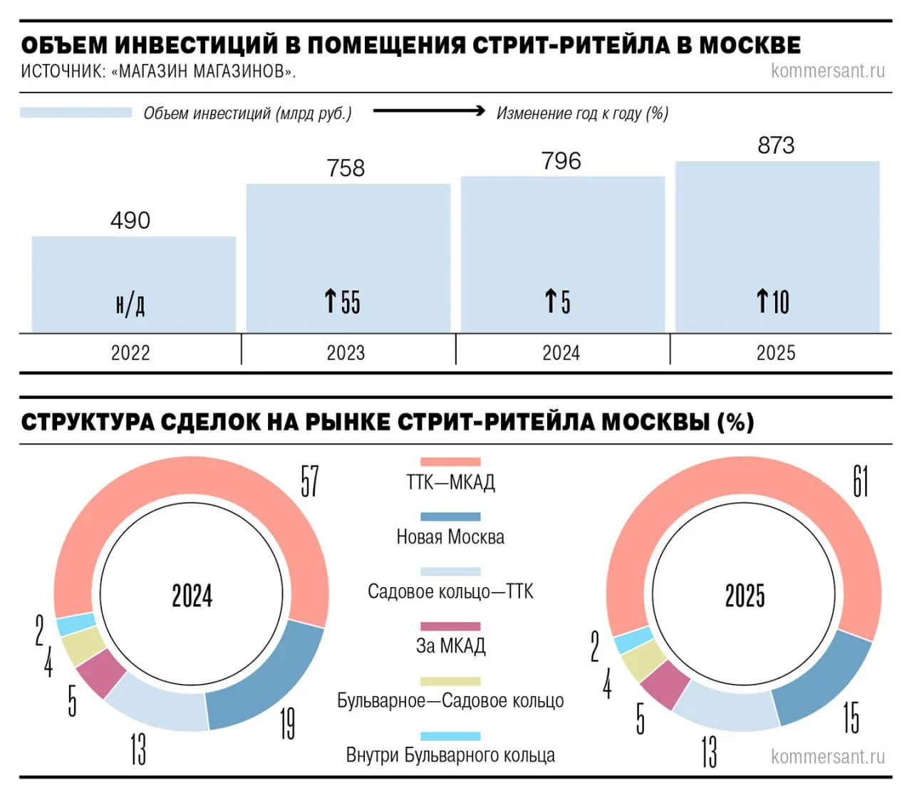 Объем инвестиций в стрит-ритейл в Москве по итогам 2025 года составил 873 млрд руб.