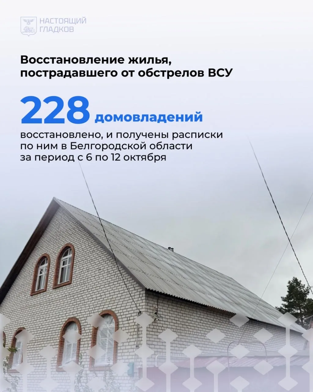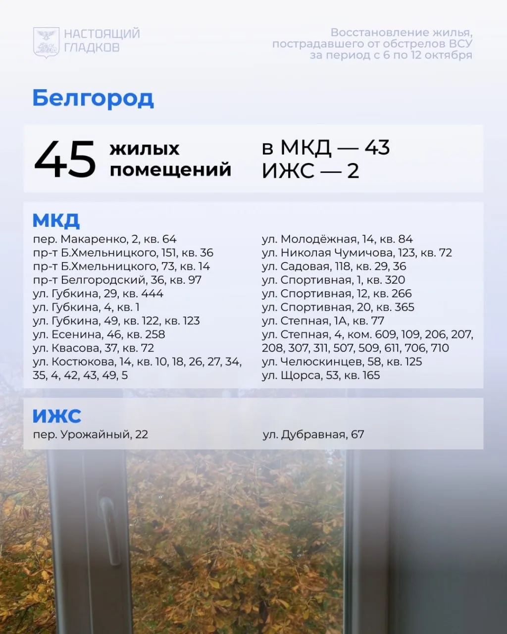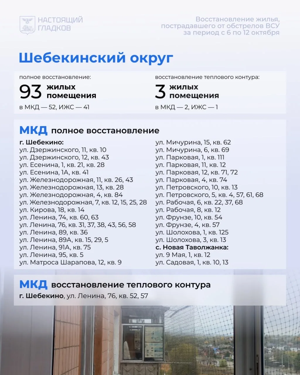В Белгороде за прошлую неделю восстановлено 45 объектов. За этот же период повреждения выявлены в 77 жилых помещениях, а также по 57 автомобилям.