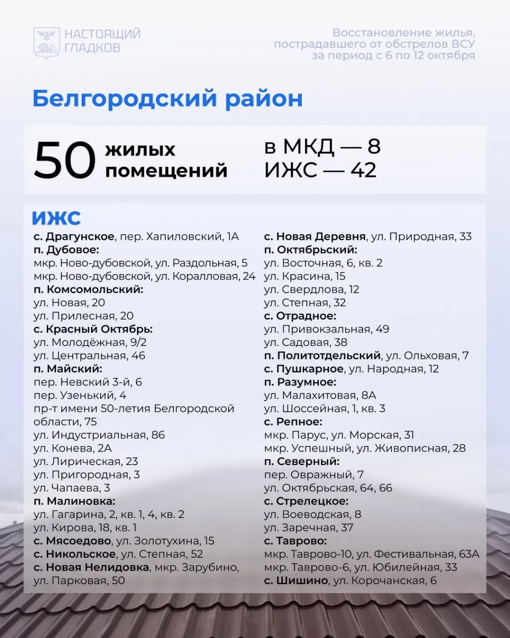 По Белгородскому району за неделю полностью восстановлено 50 объектов. Прирост на 44 повреждённых жилых помещения и 44 машины. Выплачена компенсация по 24 автомобилям.