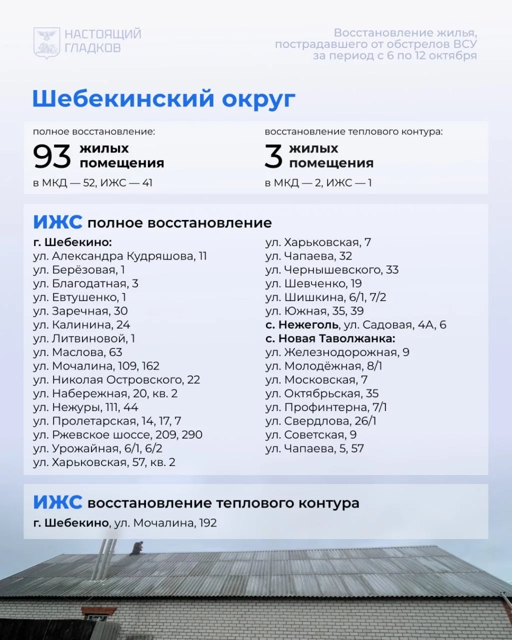 В Шебекинском округе завершили 93 объекта, закрыли контур на 3. За неделю выявлено 133 поврежденных дома и квартиры, 18 автомобилей.