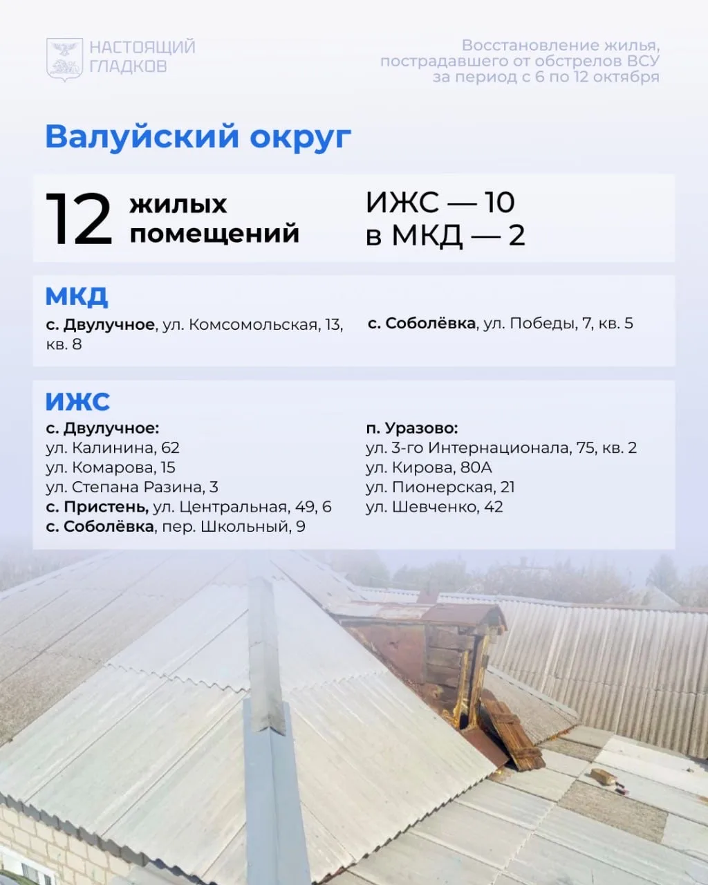 В Валуйском округе закончены 12 домов и квартир, повреждены 5 объектов, 1 автомобиль. Оплачена компенсация по 18 машинам.