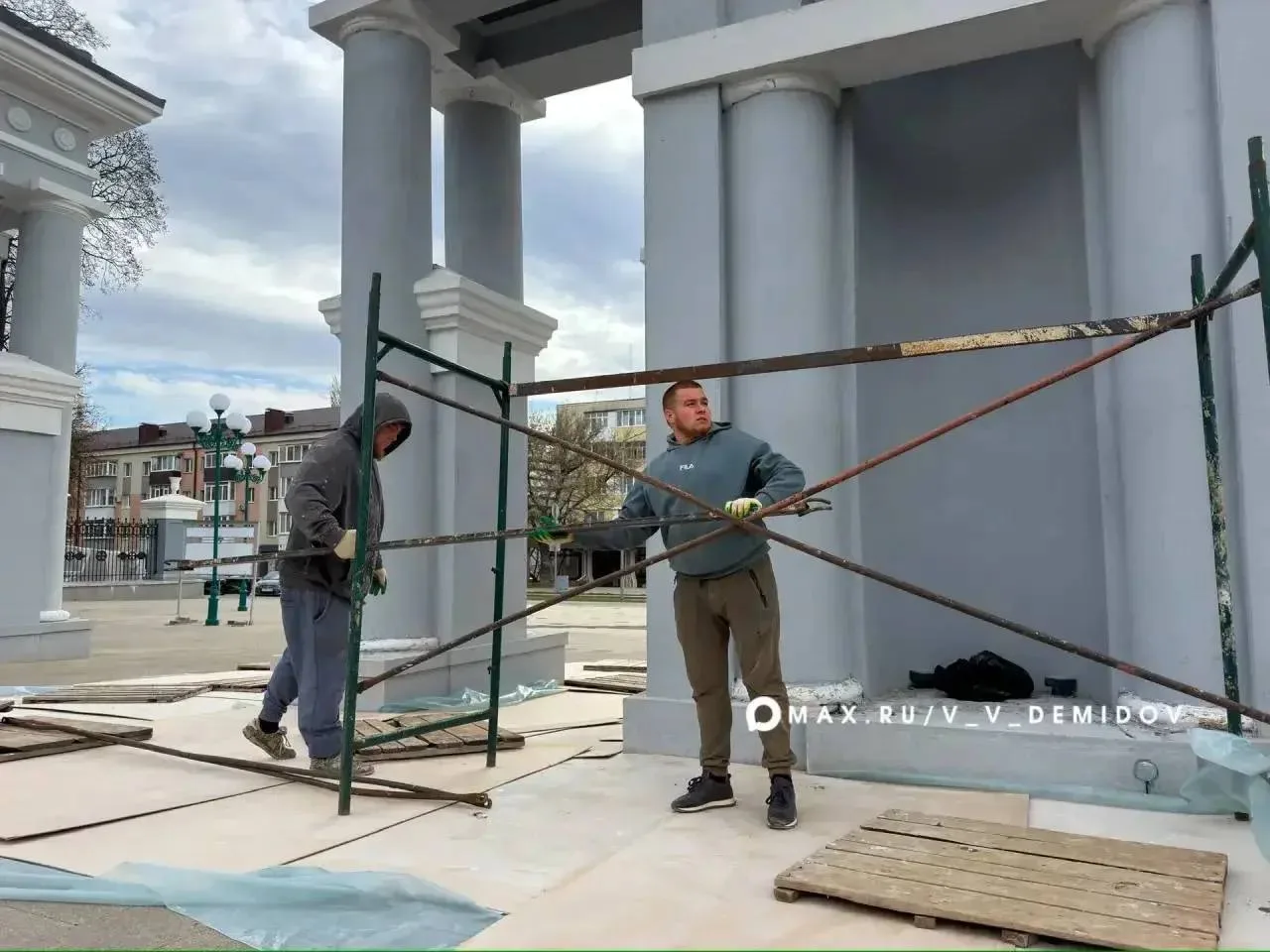 Мэр Демидов пояснил, что подрядчик защищал арку зимой временным косметическим покрытием, а с теплом приступил к финишной отделке: арку огрунтуют и покрасят стойкими составами.