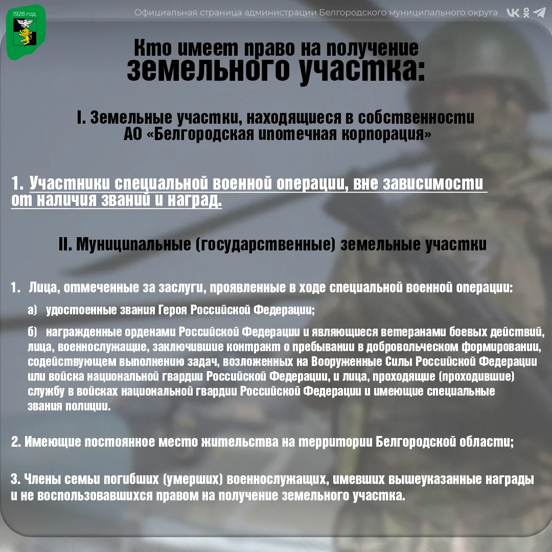 Делимся с вами памяткой о предоставлении земельных участков участникам специальной военной операции или членам их семей в Белгородском муниципальном округе