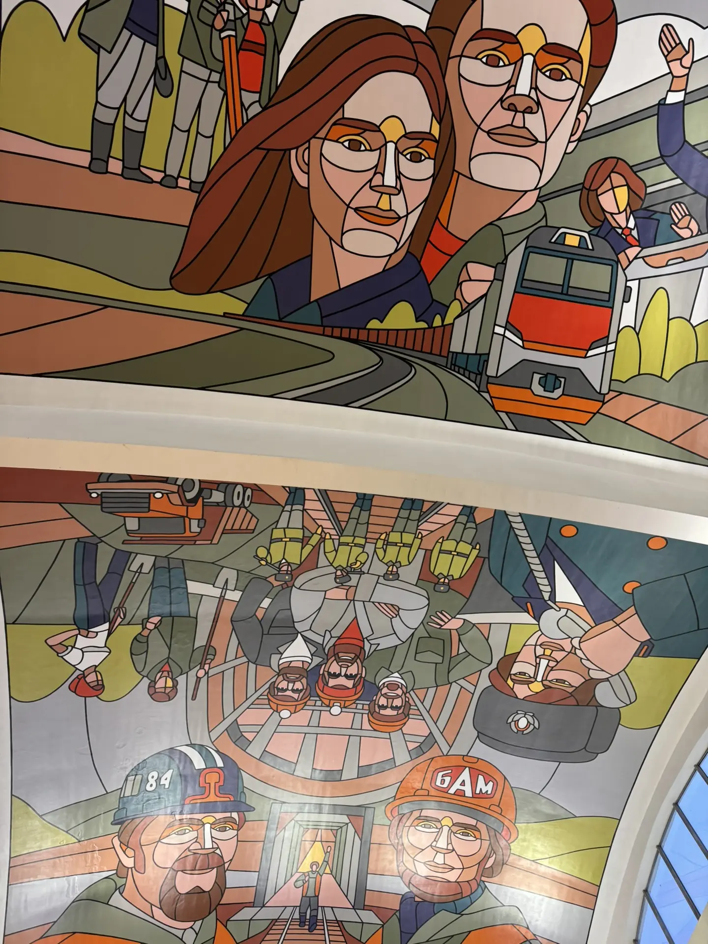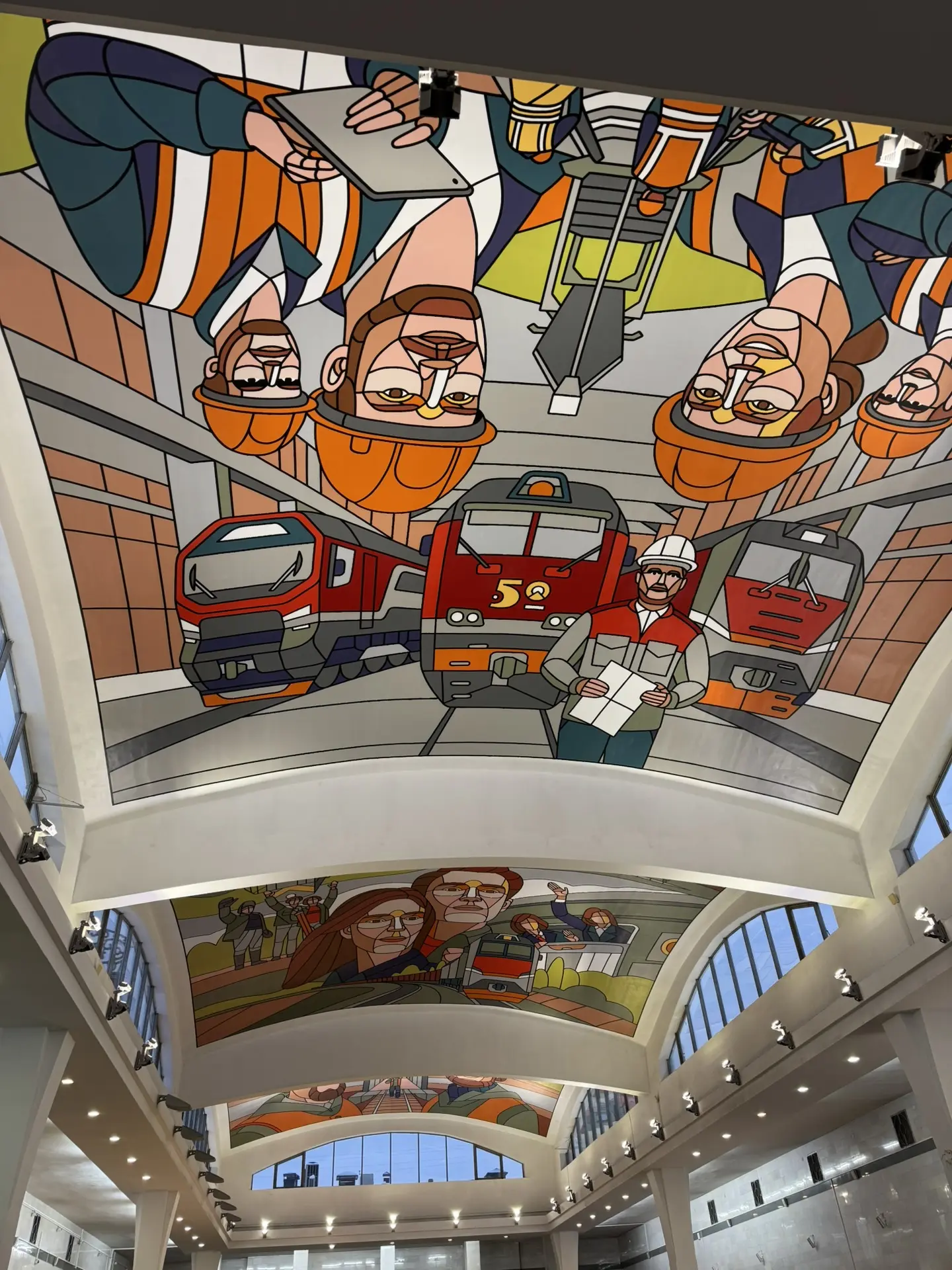 Художник Дмитрий Аске создал целый рассказ о пути, который мы прошли. От комсомольской стройки до современной модернизации. Масштаб работ (почти 840 кв. метров!) впечатляет. Очень рекомендую заглянуть.