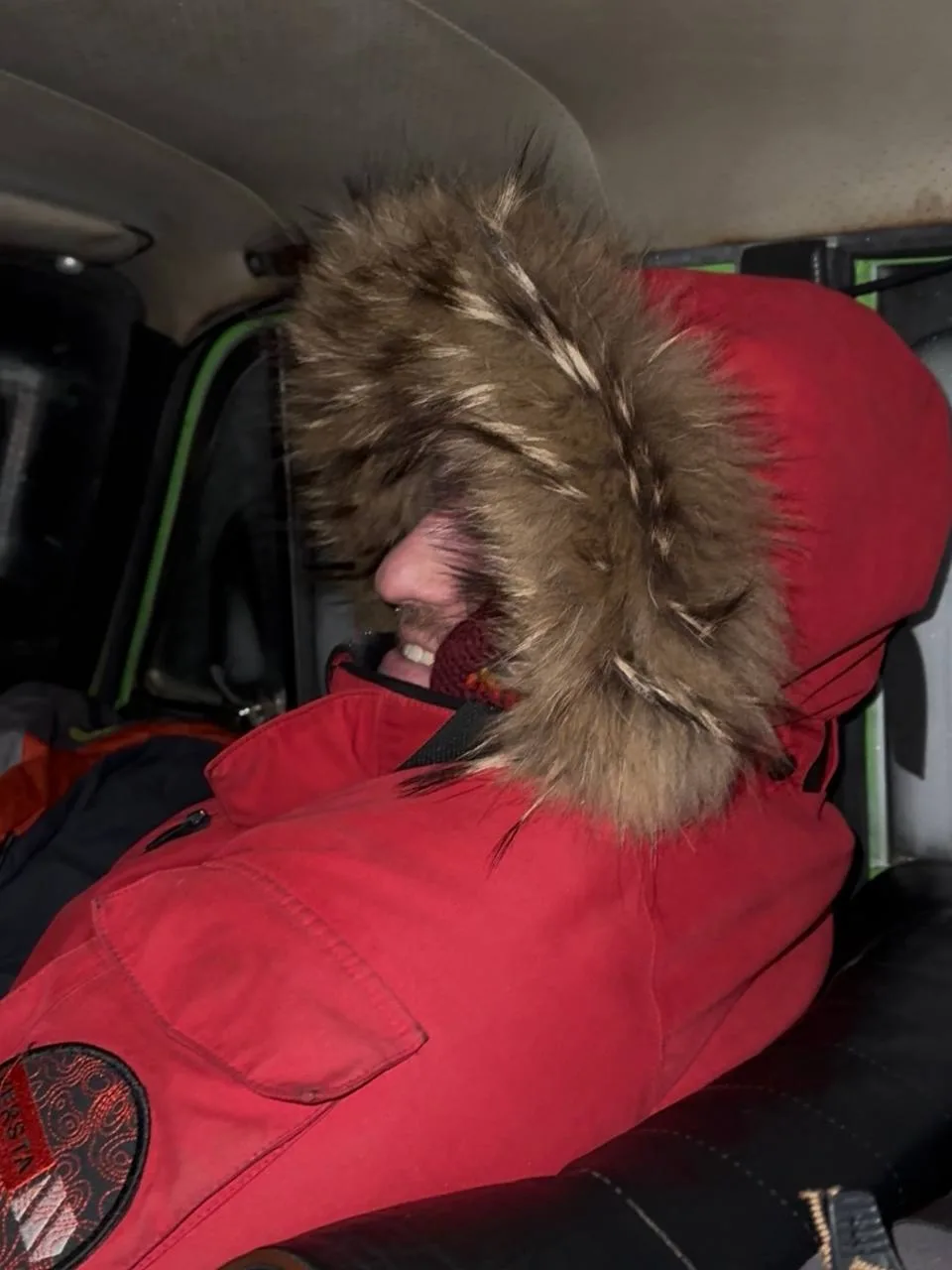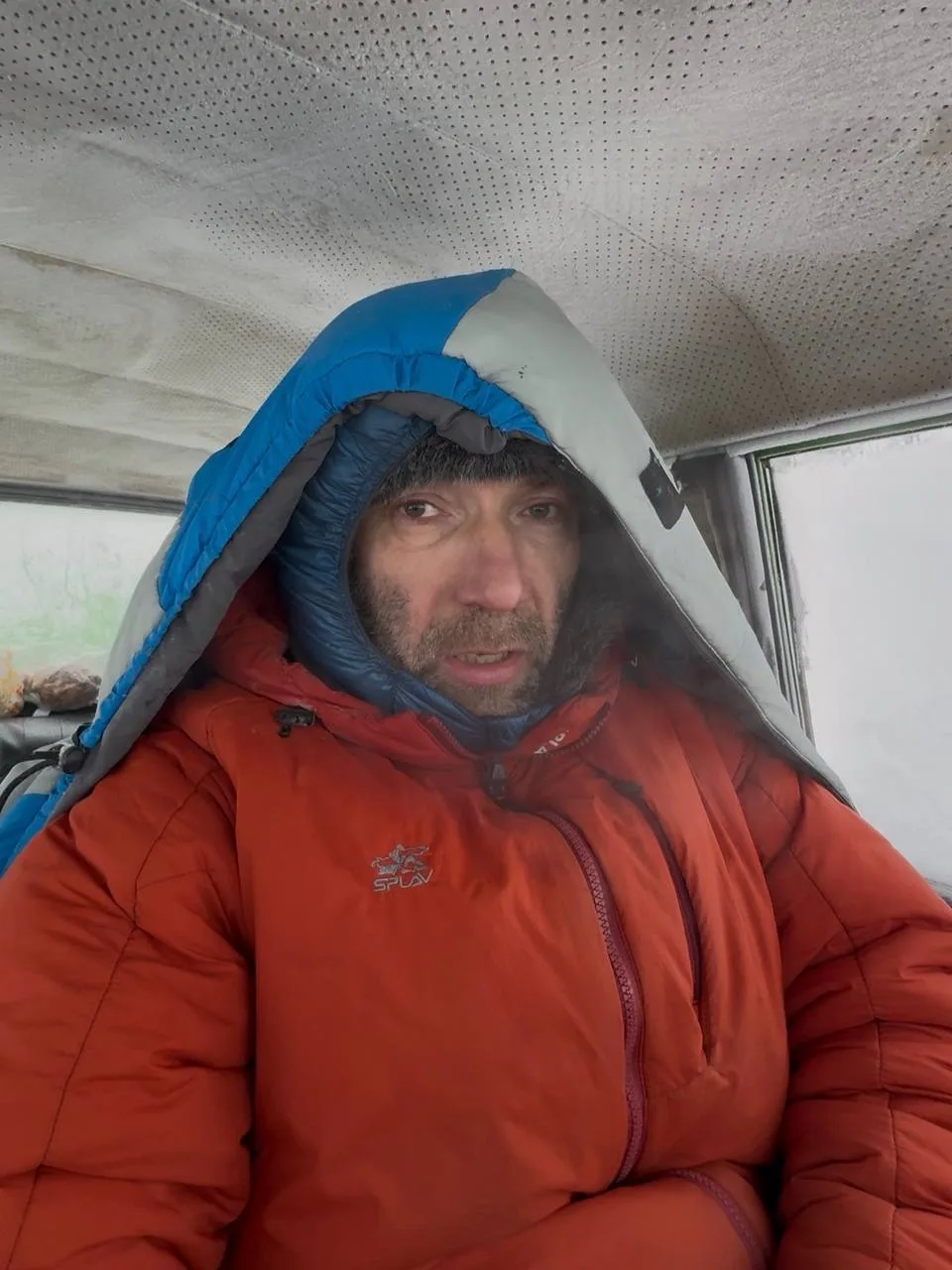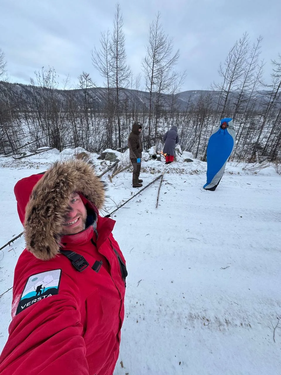 Сейчас мы попали в самые морозы (мороз достигал -50°) и поломки посыпались одна за другой. Ну и случилось то, чего боится любой водитель - машина окончательно встала. Мотор заглох. Нам пришлось почти сутки сидеть в машине и жечь костёр. К 30-градусному морозу добавился сильный ветер. Но мы не унываем! Самое главное в любых зимних поездках на автомобиле - это наличие тёплой одежды. Тогда мороз вам будет не страшен. Не забывайте это важное правило!