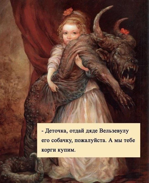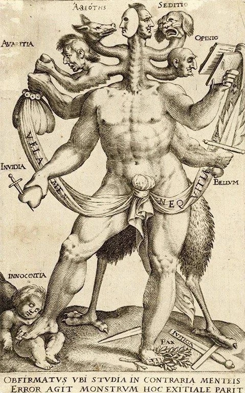 «Пять строптивых чудовищ - Безбожие, Раздор, Алчность, Вольнодумство и Война, прикрываемые Подлостью, приводят к разрушению Невинности, Справедливости и Мира».