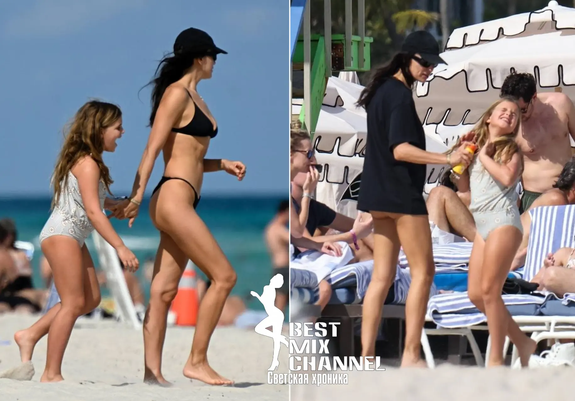 Модель отдыхает с восьмилетней Леей (дочкой от Брэдли Купера) на пляже Miami Beach. Папарацци засняли её в чёрном бикини.