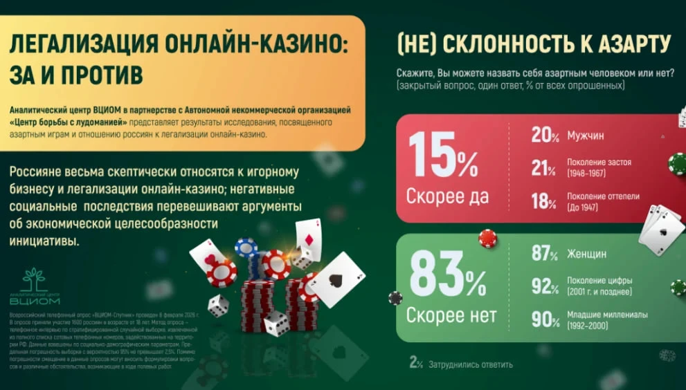 Большинство россиян скорее негативно относятся к идее легализации онлайн-казино. Об этом, как сообщают «Ведомости», свидетельствуют результаты телефонного опроса аналитического центра ВЦИОМ, проведенного в феврале среди 1600 респондентов старше 18 лет: