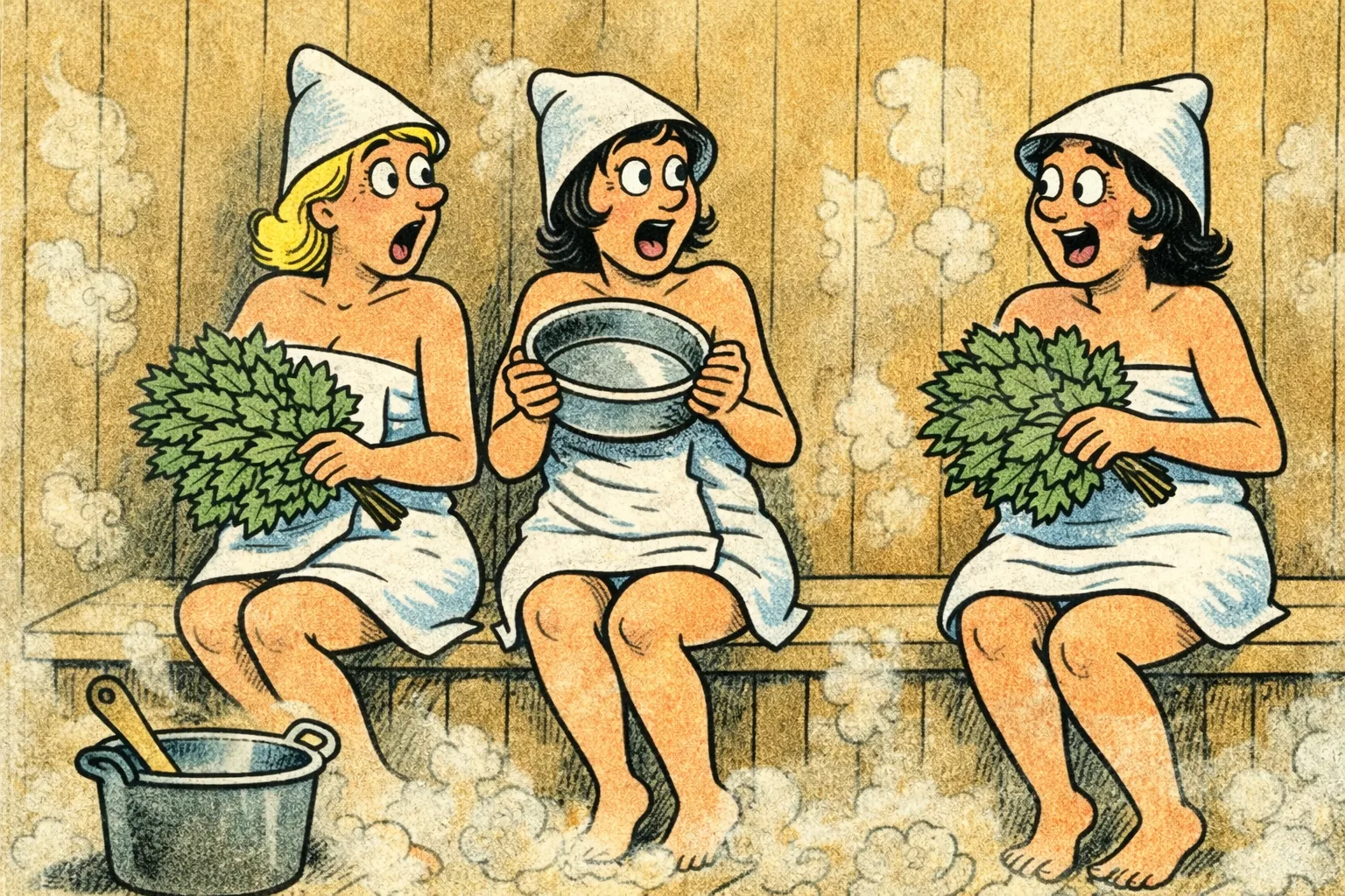 Бабы сразу завизжали, стали закрываться вениками и тазиками...