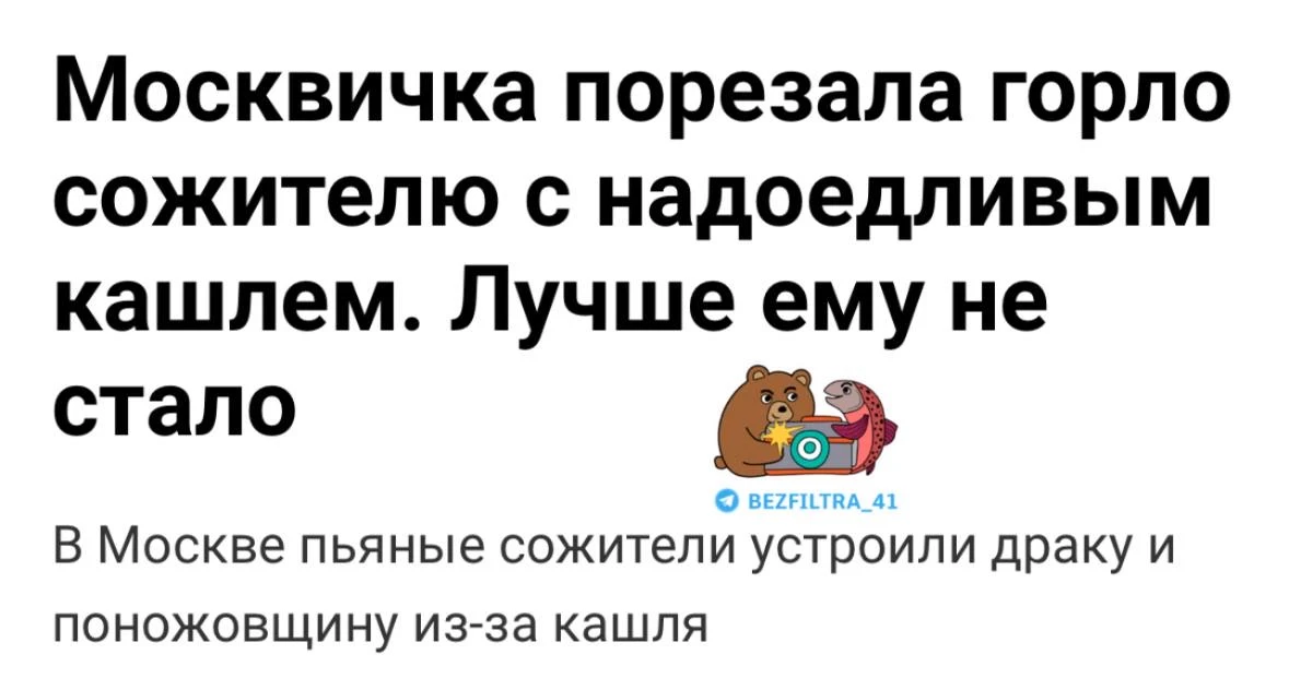 Мужчина несколько дней сильно кашлял. Его сожительницу это раздражало и она потребовала, чтобы тот пошел к врачу, но в ответ получила оскорбления и побои. Ушла на кухню-он за ней. Женщина схватила нож и ударила его в спину. Потасовка продолжилась. Она порезала партнеру горло и щеку.