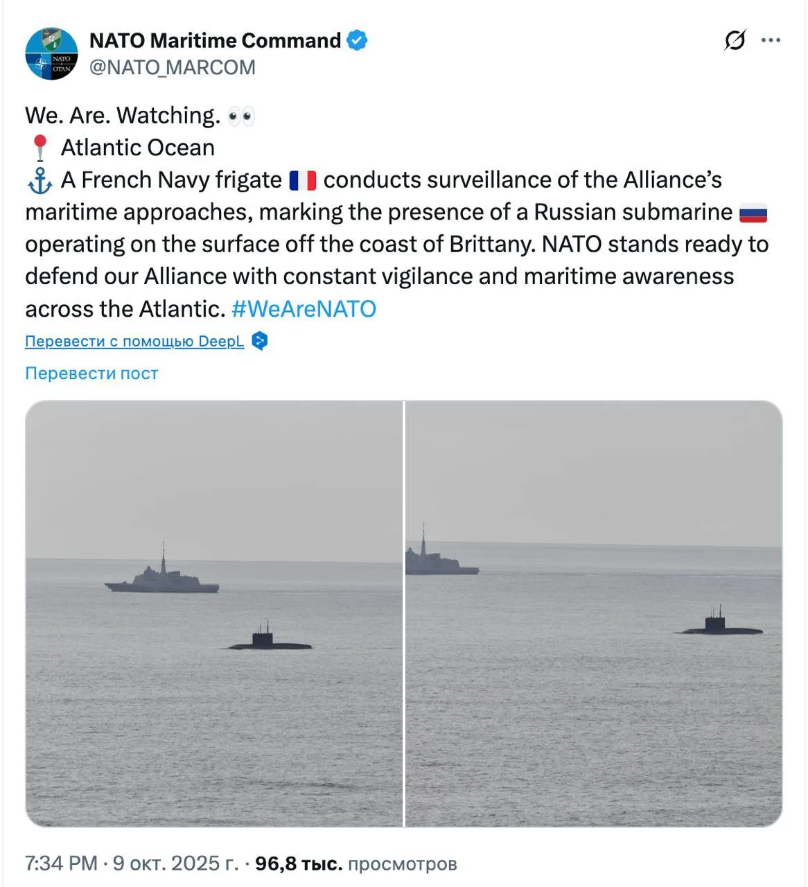 Военные НАТО засекли «российскую подлодку» у побережья Франции, сообщило Морское командование альянса. Западные СМИ сообщали, что подлодка совершила экстренное всплытие, так как из-за повреждений в топливной системе топливо поступает прямо в трюм.
