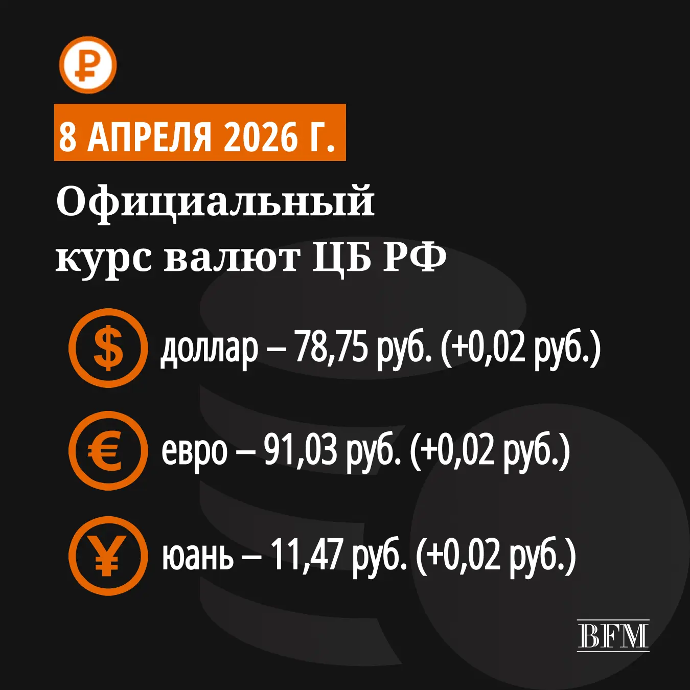 Официальные курсы ЦБ на 8 апреля: доллар — 78,75 рубля (повышение на 2 копейки), евро —91,03 рубля (повышение на 3 копейки).