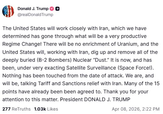Иран не будет заниматься обогащением урана, а Штаты совместно с ним «откопают и уберут всю глубоко захороненную (бомбардировщиками B-2) ядерную "пыль"».