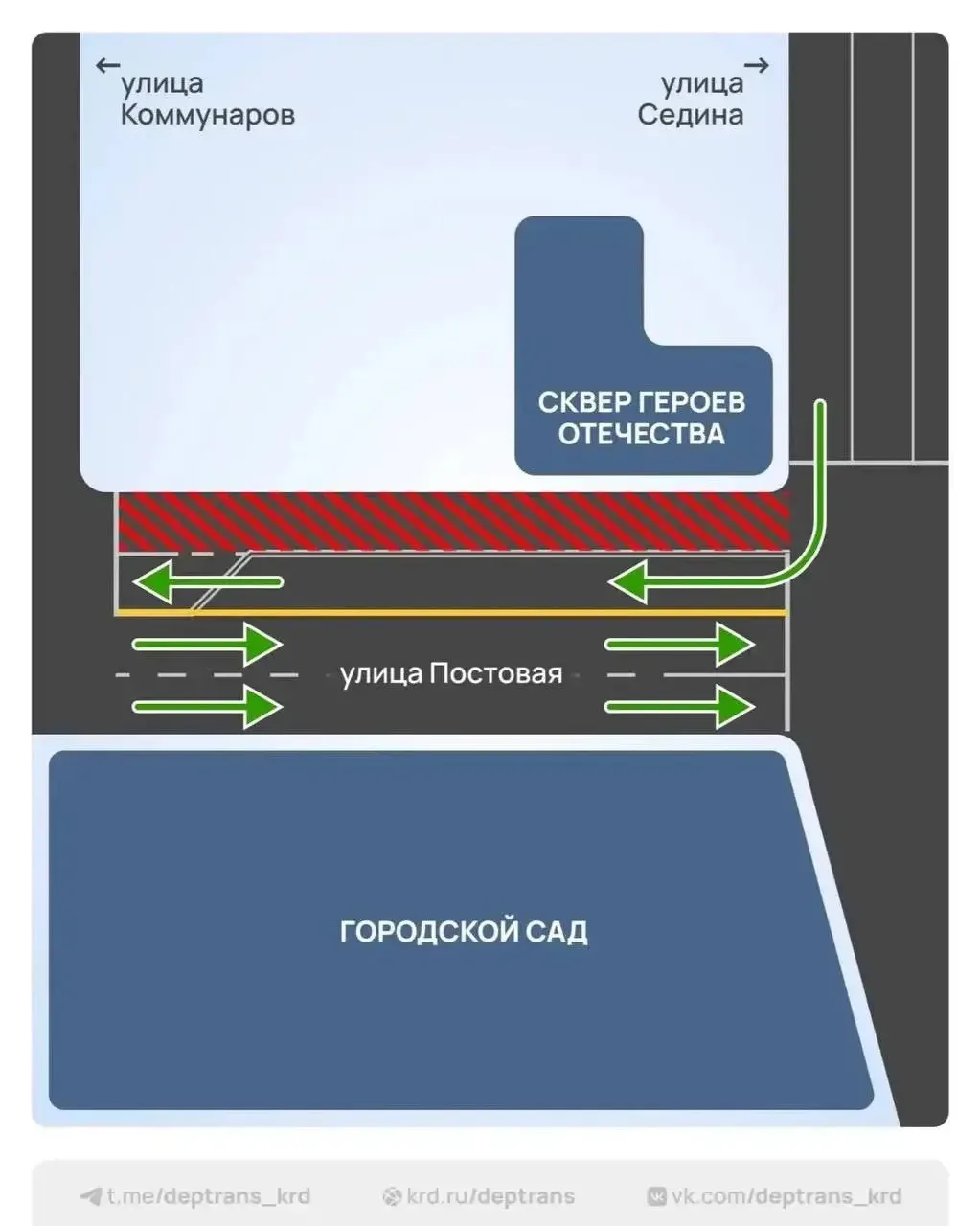 Движение транспорта будет осуществляться по встречной полосе. В противоположном направлении, от Коммунаров до им. Митрофана Седина, движение будет организовано по оставшимся двум полосам.