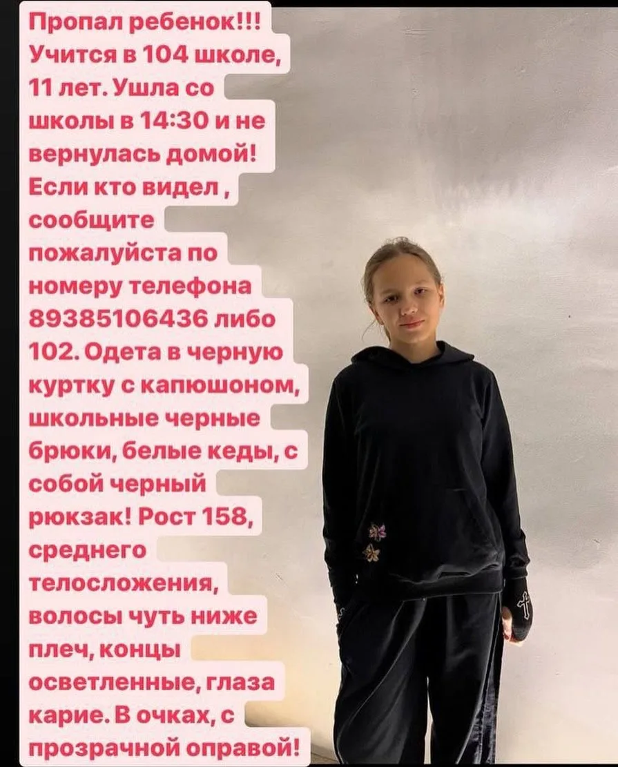 Зовут - Михелина, 11 лет. Высокая, рост примерно 155 см. Телефон оставила дома. Учится в 104 школе на Аверкиева.