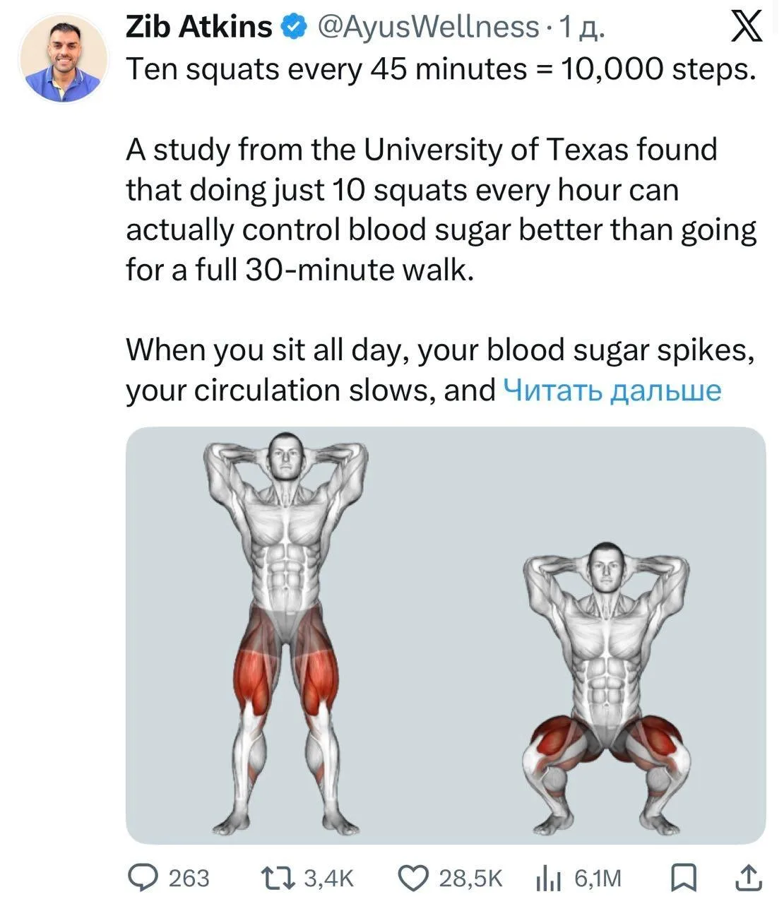 Всего 10 приседаний каждые 45 минут эффективнее, чем разовая прогулка на 10 000 шагов — к такому выводу пришли исследователи из Техаса.