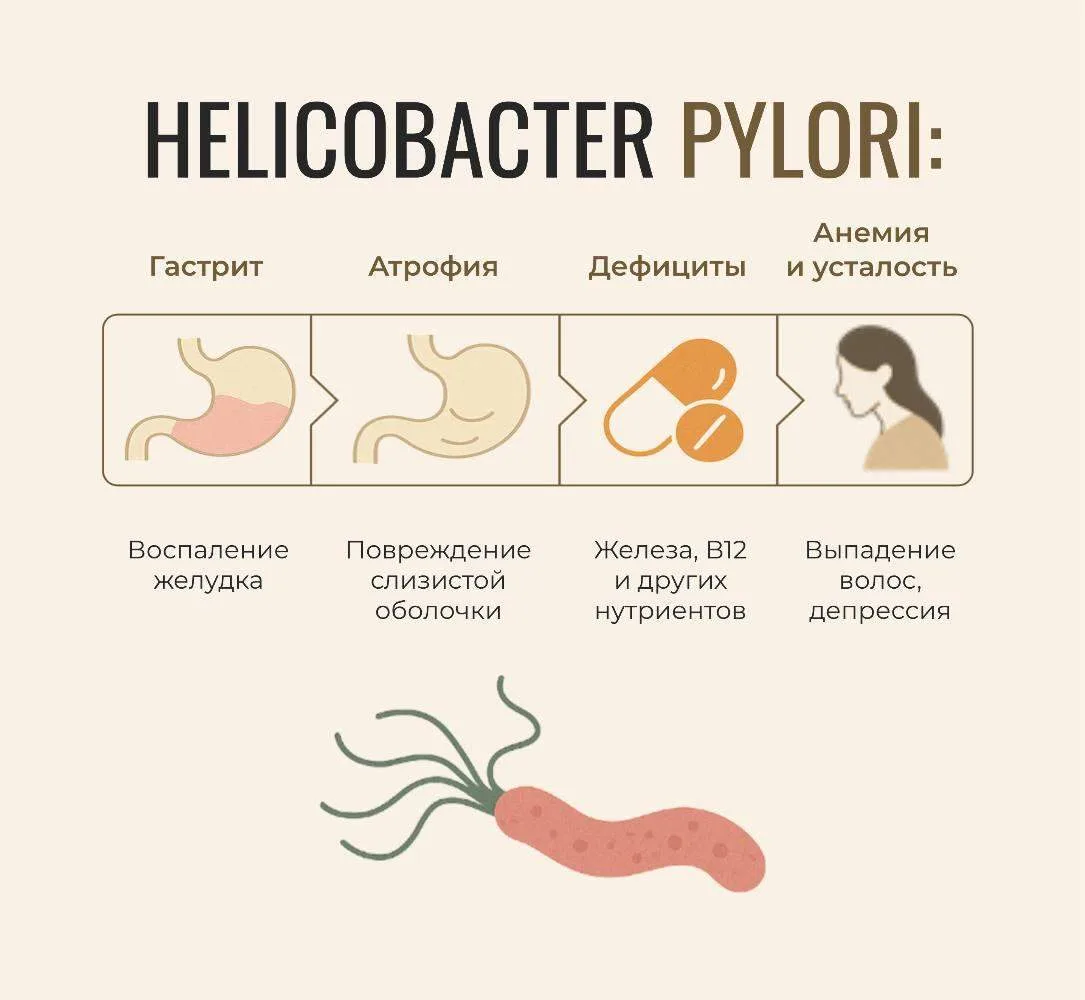 Эта бактерия живет в каждом втором человеке. Она вызывает гастриты, язвы, повышает риск рака желудка в 6 раз, а также снижает усвоение важных элементов: