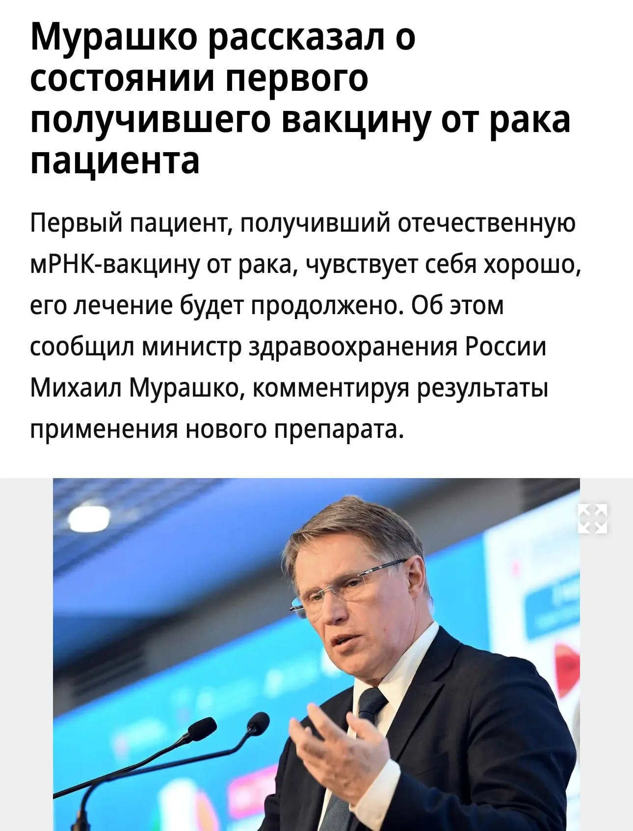 Речь о персонализированной мРНК-вакцине «Неоонковак», которую 1 апреля впервые ввели 60-летнему пациенту с меланомой кожи. Лечение продолжают.