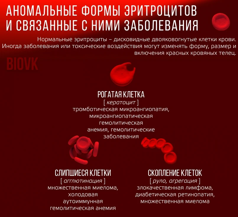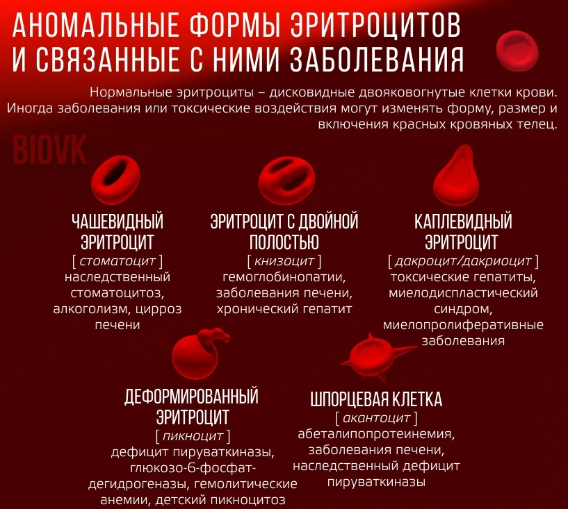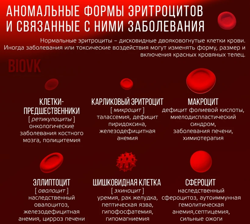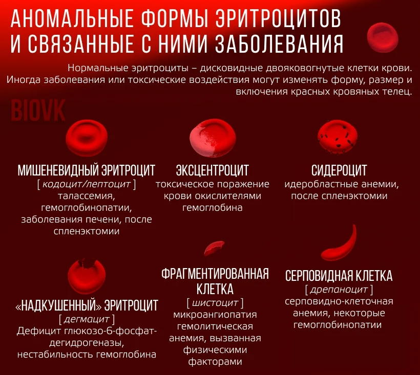 Итак, любое изменение формы (пойкилоцитоз) или размера (анизоцитоз) клеток или появление включений, гранул в эритроцитах угнетает их функциональность и усугубляет кислородное голодание организма. Исследование под микроскопом мазка крови – это универсальный тест при диагностике многих патологических состояний. #патология #гематология #биология #инфографика #гистология