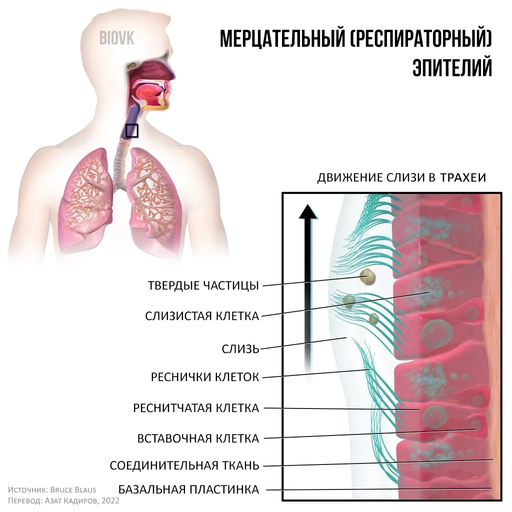 Респираторный эпителий — это слой клеток, который покрывает внутреннюю поверхность дыхательных путей. Он играет важную роль в защите организма от вредных веществ, которые могут попасть в легкие при дыхании. #инфографика #биология #гистология