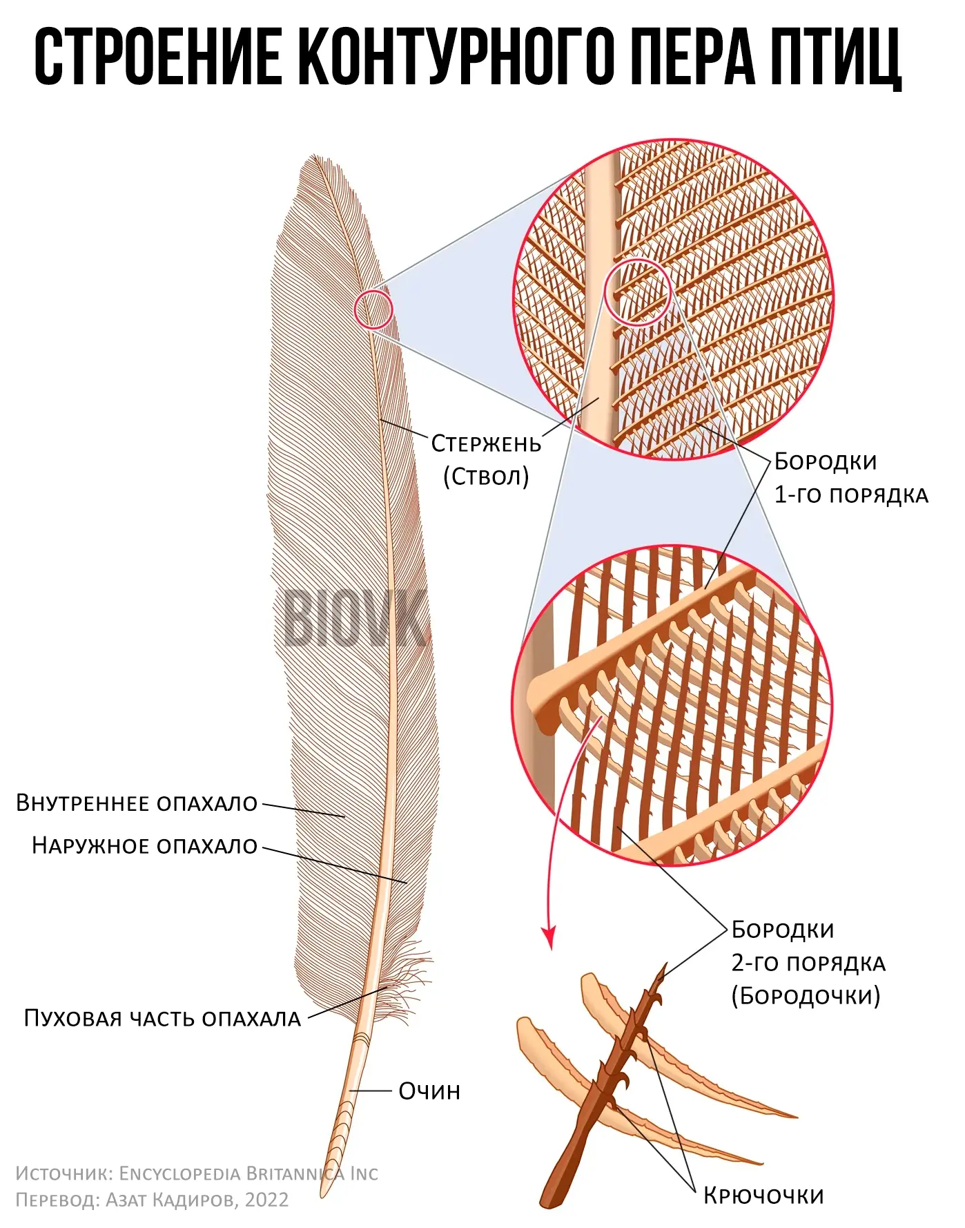 Перо представляет собой роговое образование, производное кожи. От стержня пера отходят выросты — бородки, которые в свою очередь несут бородочки, которые сцепляются друг с другом. Такое строение позволяет создать лёгкую двухмерную структуру из одномерных выростов. Конструкция помогает птицам легко восстанавливать структуру и форму пера, если оно повредилось и бородочки расцепились. Кстати, такие же перья были у предков и родственников птиц — многих динозавров, а нечто похожее палеонтологи находят и у птерозавров. #схемы #орнитология #биология