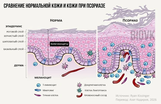 В результате здоровая кожа живёт размеренной жизнью с чёткой архитектурой и минимальным шумом, а кожа при псориазе — это хронический внутренний митинг, где кератиноциты работают сверхурочно, иммунные клетки слишком мотивированы, а порядок слоёв нарушен по всем пунктам. И хотя внешне это выглядит как просто шелушение, внутри это целая драма с элементами экшена, где никто не уходит в отпуск и все слишком стараются помочь — но не тем и не так.