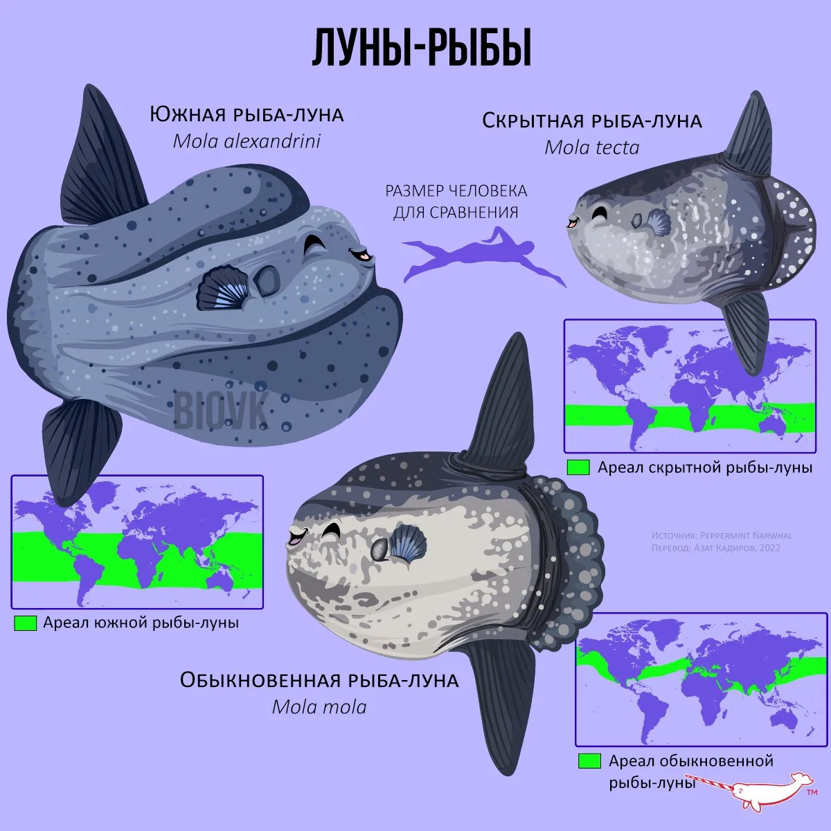 Между прочим, это крупнейшие из костных рыб (по массе). По счастью, они совершенно безобидны для человека. Не чета акулам. Основная еда рыб-лун — это медузы и сальпы. Но по мере необходимости они могут подъедать и другие планктонные организмы. #биология #ихтиология #инфографика