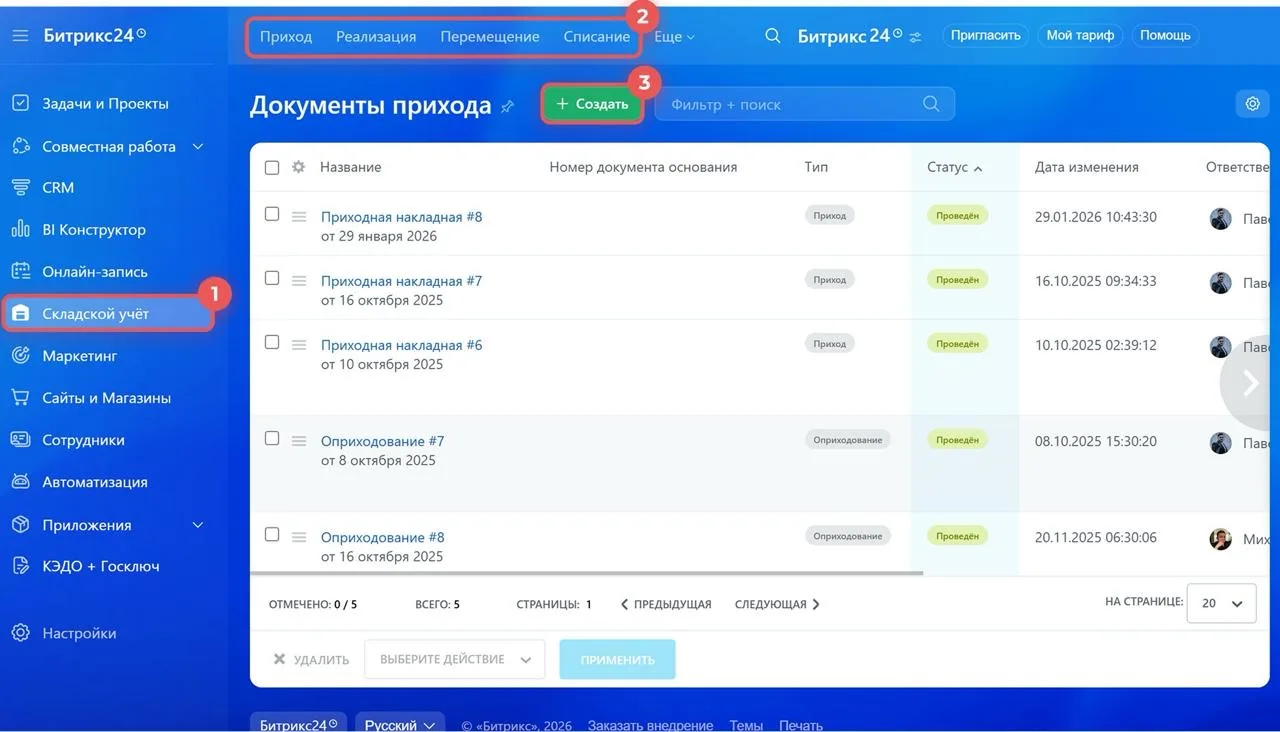 Вместо ручного поиска по названию сотрудник сканирует штрихкод, и Битрикс24 автоматически добавляет товар в документ.