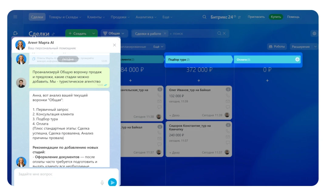 Агент Марта AI — ваш персональный помощник по Битрикс24 на базе искусственного интеллекта. Просто напишите в чат — Агент Марта подскажет, как работать с инструментами или что делать в конкретной ситуации, а по команде выполнит действия: создаст сделку, поставит задачу и так далее.