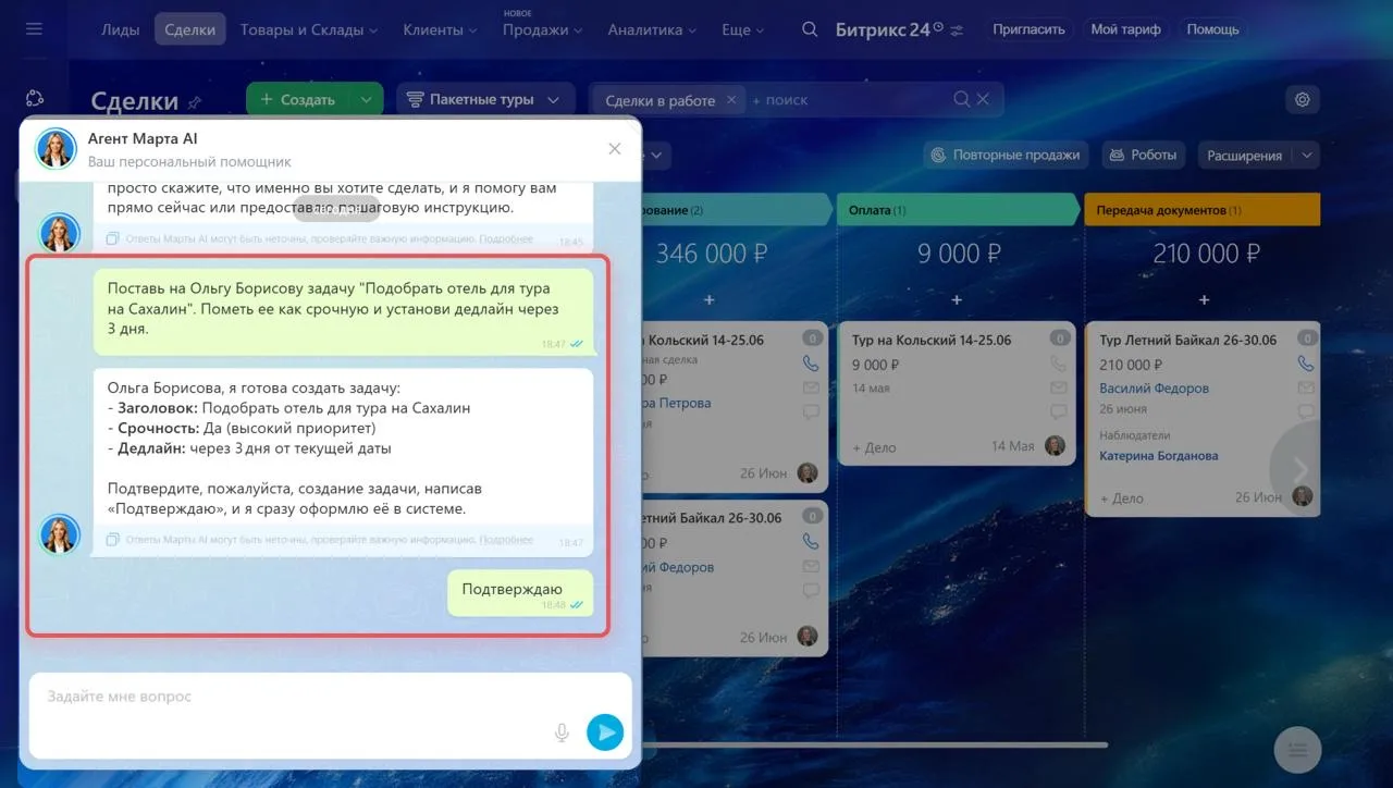 Сейчас с помощью Агента Марта можно работать с CRM и задачами, а в будущем — управлять всеми разделами Битрикс24.
