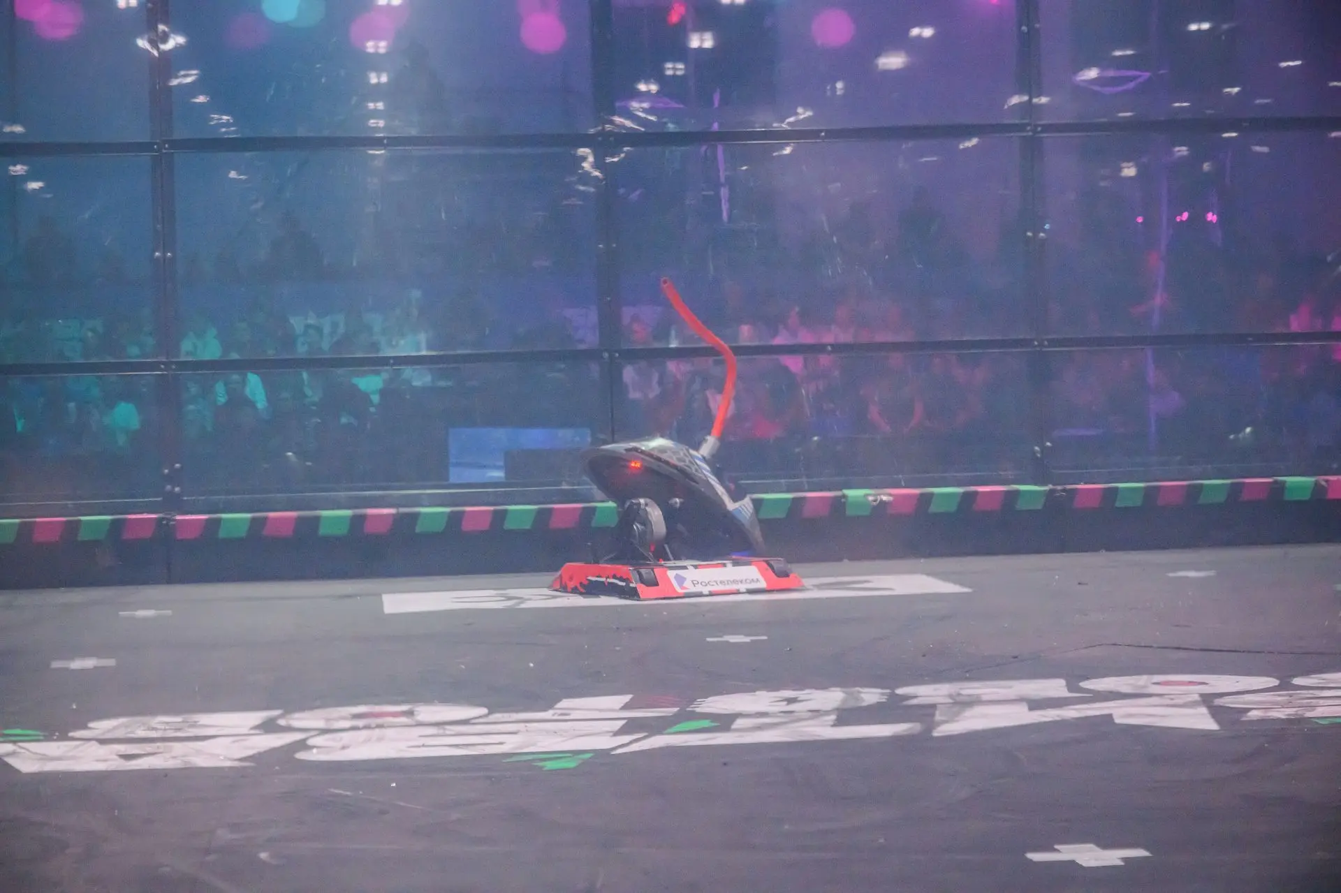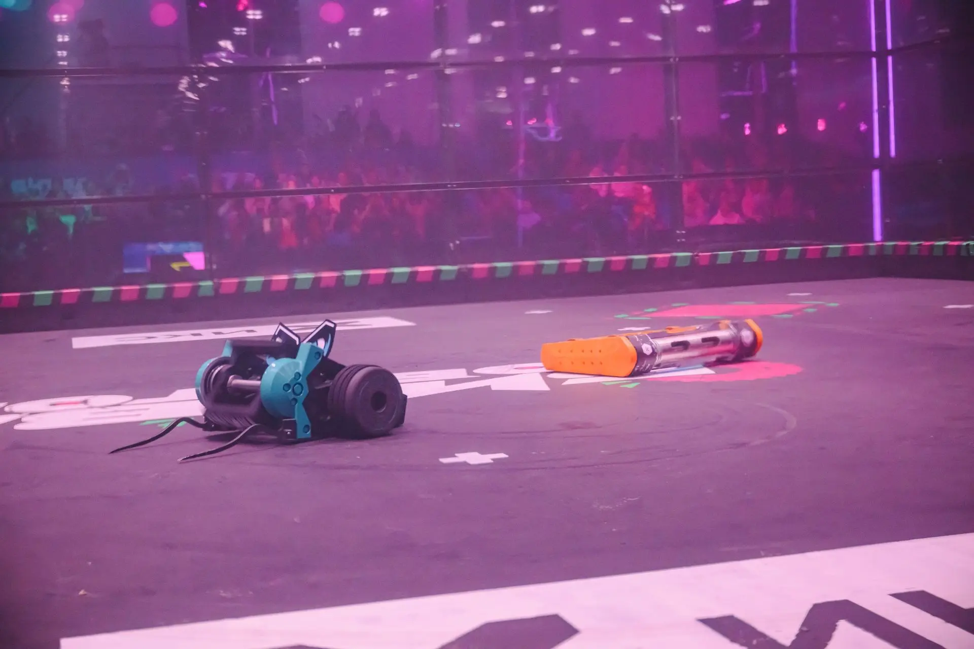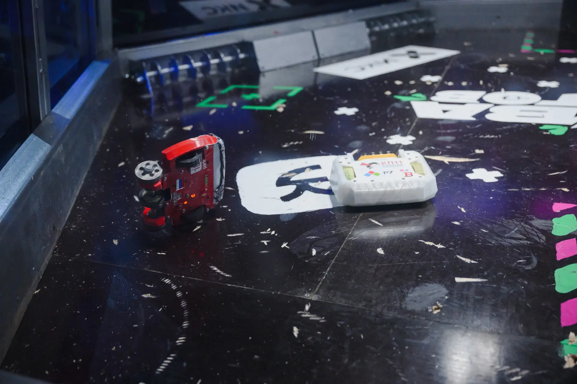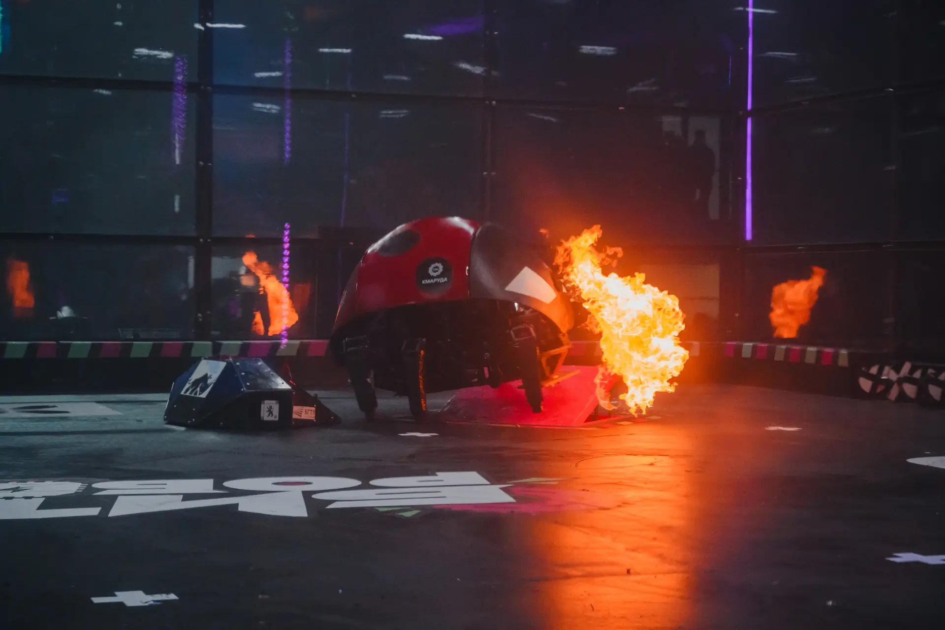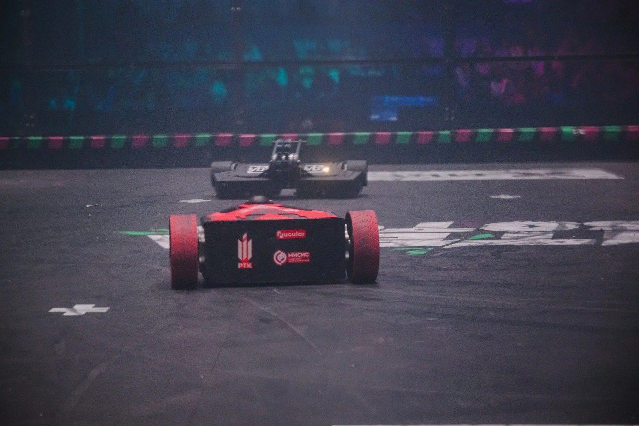 Одной из команд не удалось привести робота в движение после первого же сокрушительного удара соперника. Несколько секунд решили исход встречи — это нокаут!