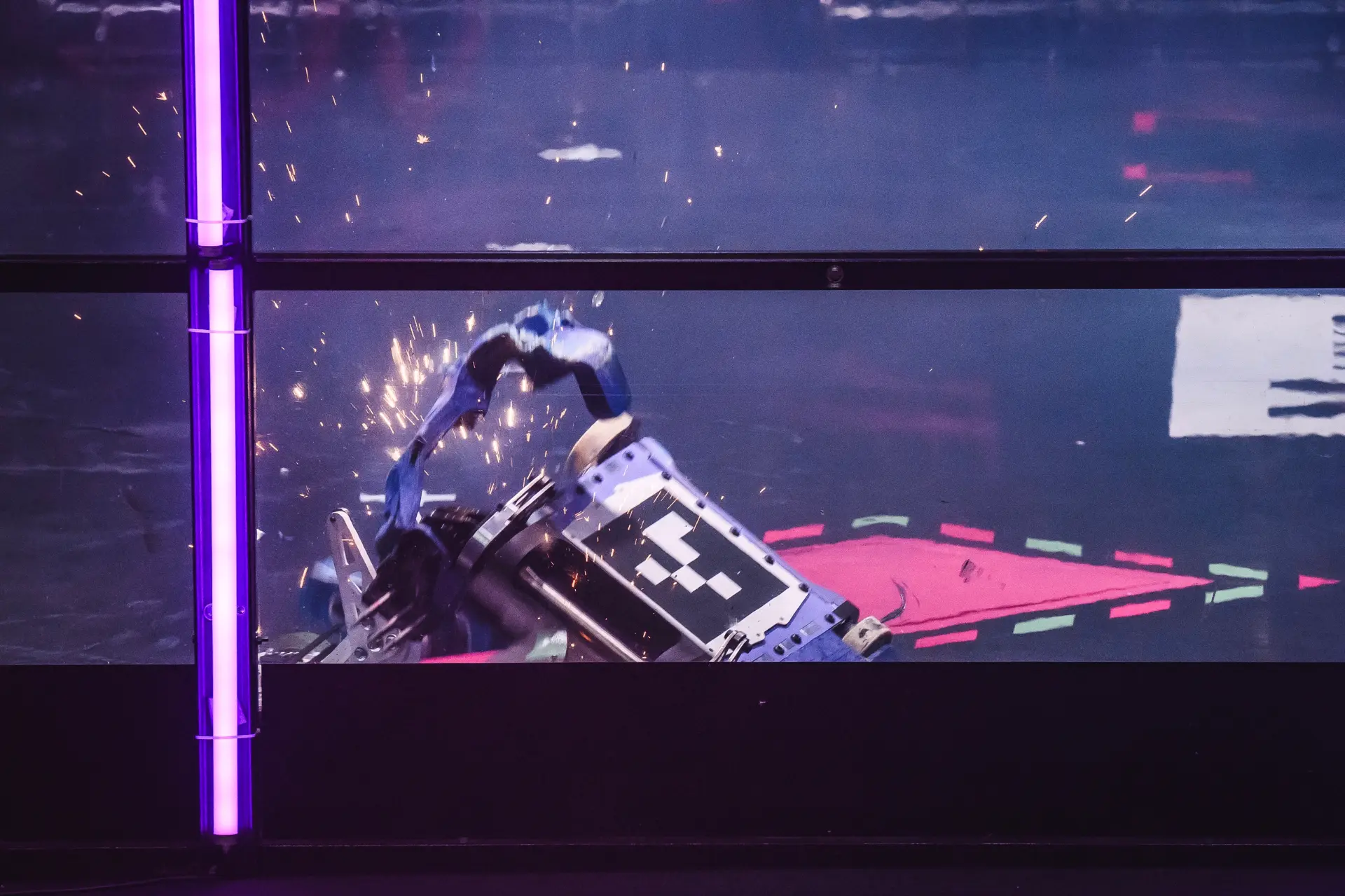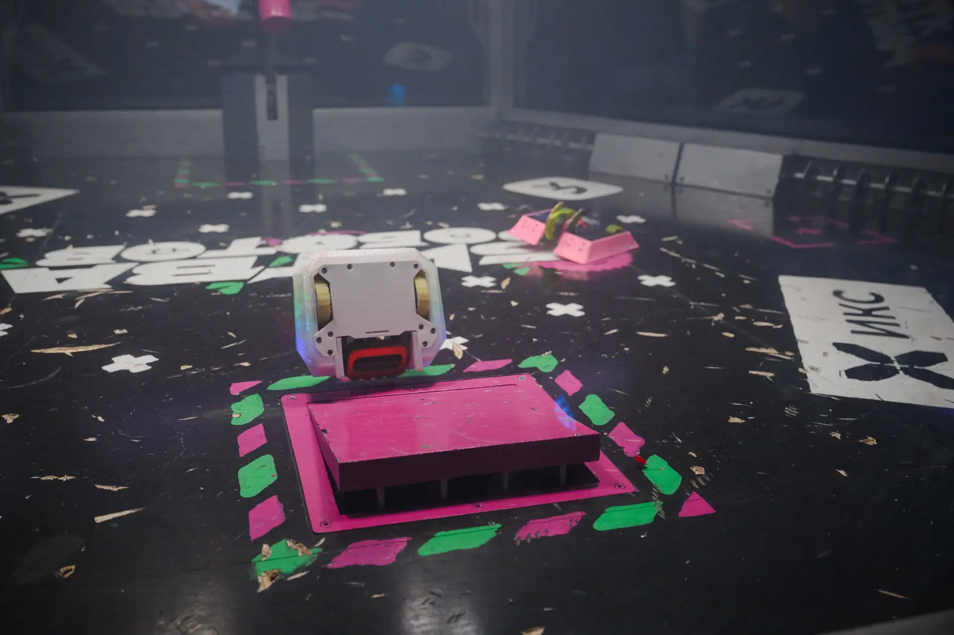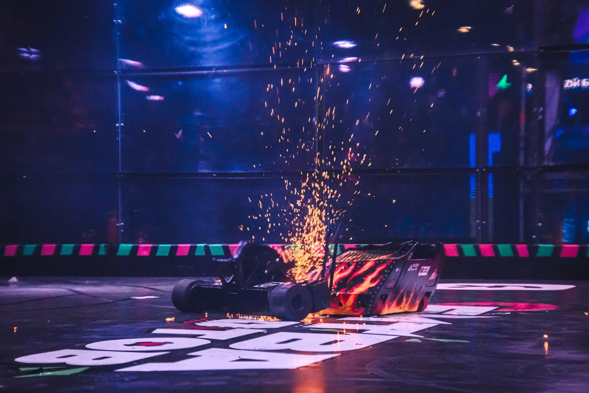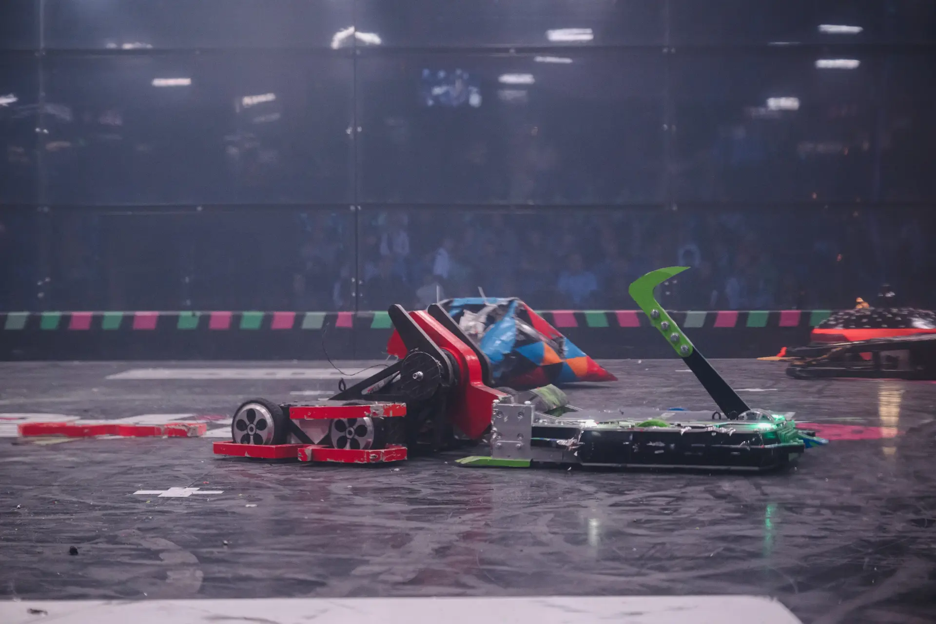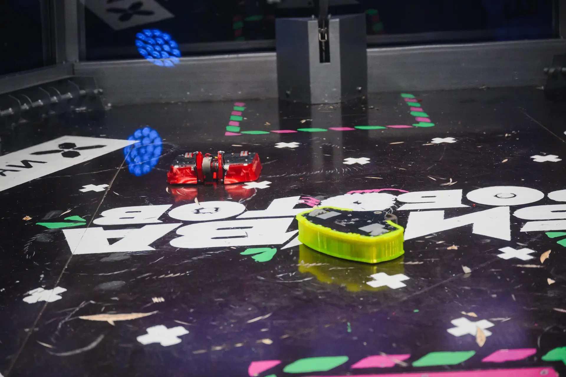 Одной из команд не удалось привести робота в движение после первого же сокрушительного удара соперника. Несколько секунд решили исход встречи — это нокаут!