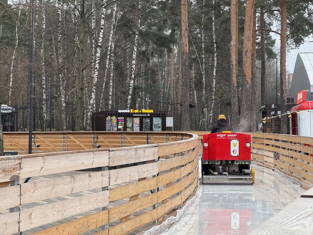 В ожидании первых гостей — каток в парке «Пехорка». Рабочие полируют покрытие и проводят последние приготовления.