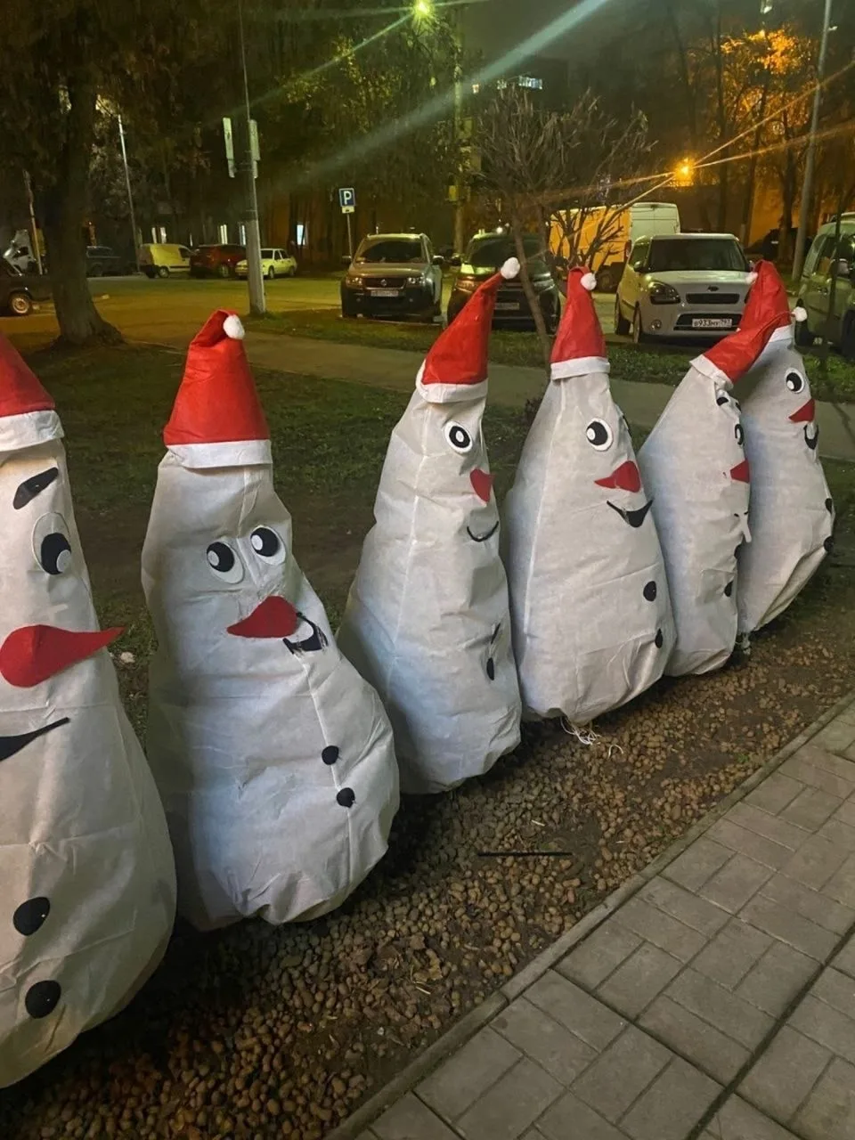 Деревья укрыли на зиму и сделали снеговичков ⛄️