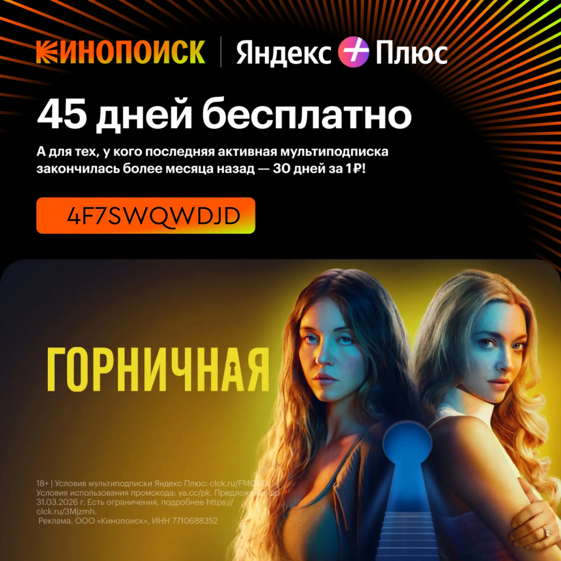 Переходите по ссылке https://kp45.prfl.me/blog_shopogolika/98ldnk?erid=2RanynCEMSr и оформляйте бесплатный доступ на 45 дней для новых пользователей по промокоду 4F7SWQWDJD и 30 дней за 1 ₽ для пользователей без активной мультиподписки Яндекс Плюс более 30 дней и тех, кто ранее не использовал услугу реактивации.